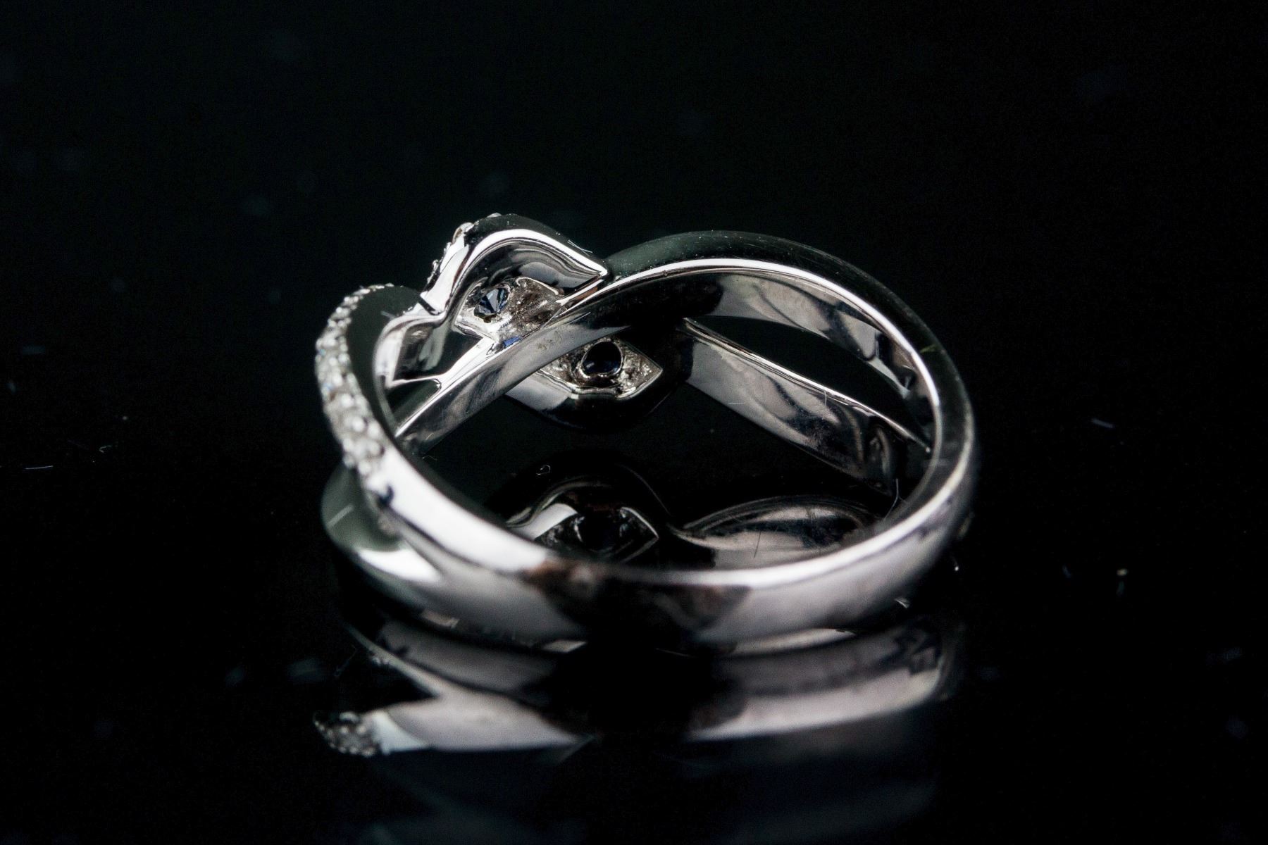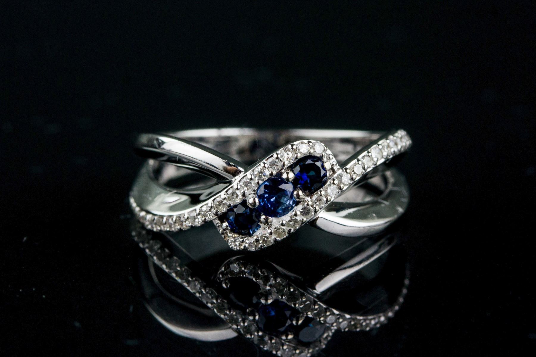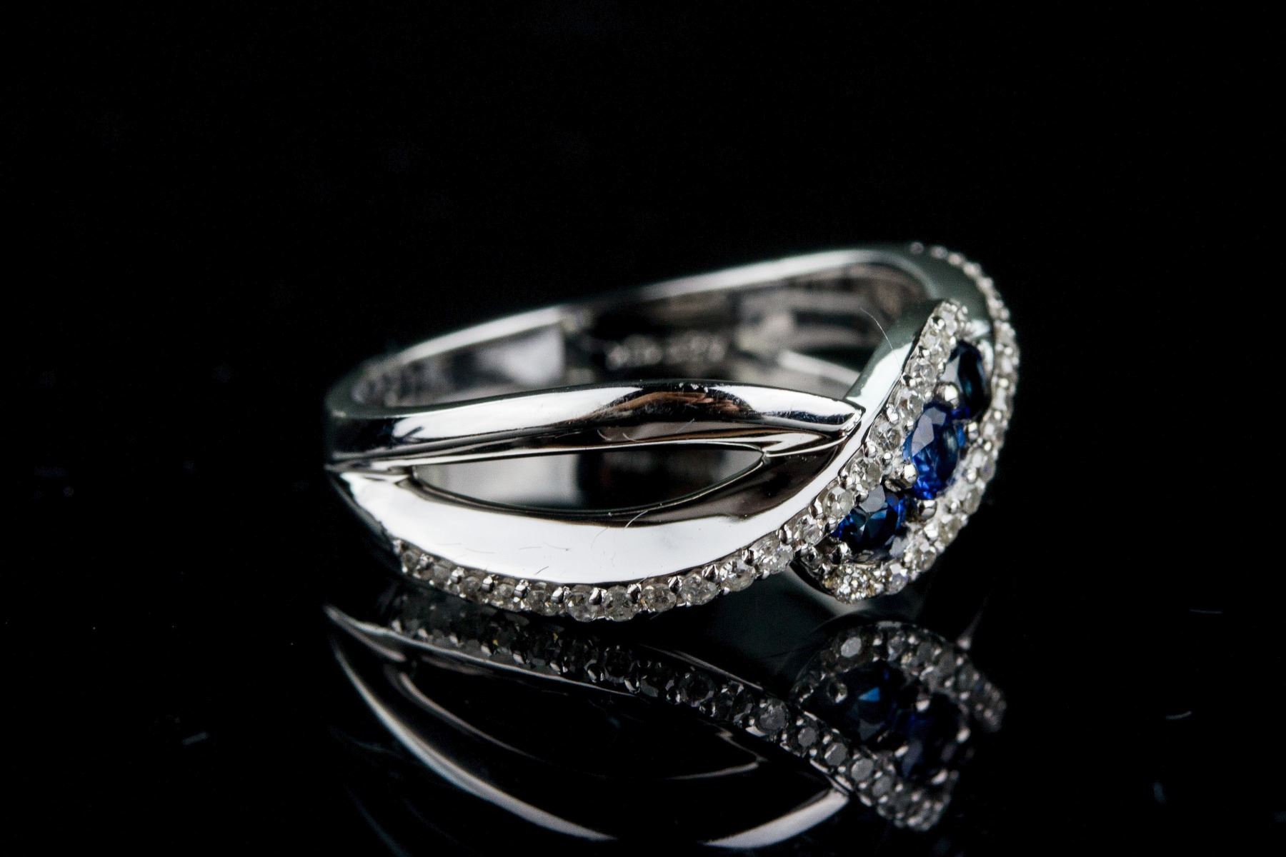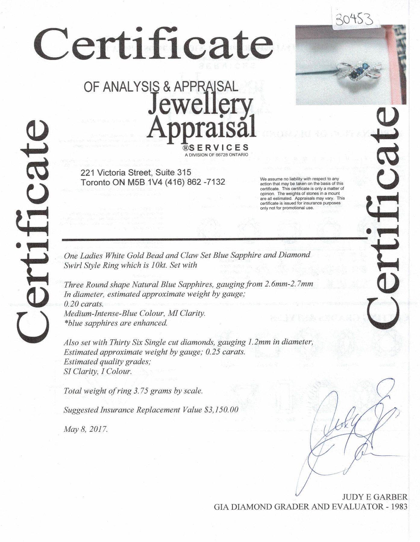 Stamped 10k white gold swril ring; set with 3 round 0.20ct blue sapphires with 36 single cut 0.25ct diamonds; certified replacement value $3150; 3.75 grams