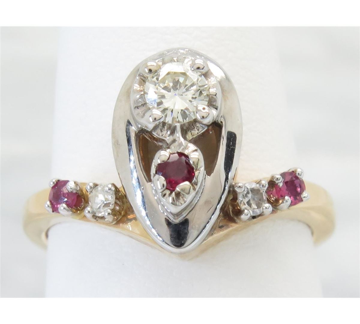 One tested 14K yellow gold diamond and ruby ring. Containing: One Round Brilliant Cut Diamond weighing approximately .16CT and 2 Single Cut Diamonds weighing approximately 0.04CTW. The ring also contains three rubies weighing approximately .12CTW. Diamonds are graded in the mounting, unless otherwise stated. Weight: 4.2 grams, Size: 5.25.