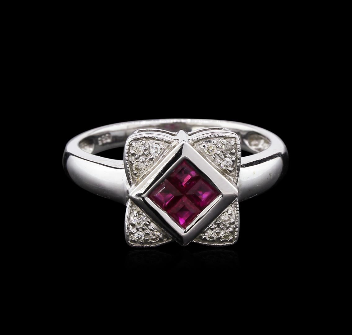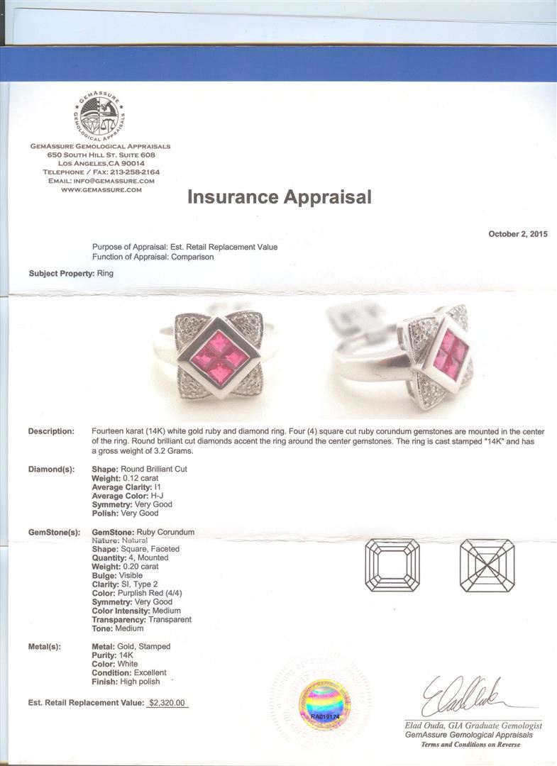 Fourteen karat (14K) white gold ruby and diamond ring. Four (4) square cut ruby corundum gemstone is prong mounted in the center of the ring. Round brilliant cut diamonds accent the ring around the center gemstone. The ring is cast stamped "14K" and has a gross weight of 3.2 Grams. Diamond(s): Shape: Round Brilliant Cut. Weight: 0.12 carat. Average Clarity: I1. Average Color: H-J. Symmetry: Very Good. Polish: Very Good. GemStone(s): Ruby Corundum. Nature: Natural. Shape: Square, Faceted. Quantity: 4, Mounted. Weight: 0.20 carat. Bulge: Visible. Clarity: SI, Type 2. Color: Purplish Red (4/4). Symmetry: Very Good. Color Intensity: Medium. Transparency: Transparent. Tone: Medium. Metal(s): Metal: Gold, Stamped. Purity: 14K. Color: White. Condition: Excellent. Finish: High polish. GGA Appraised at $2,320.00.