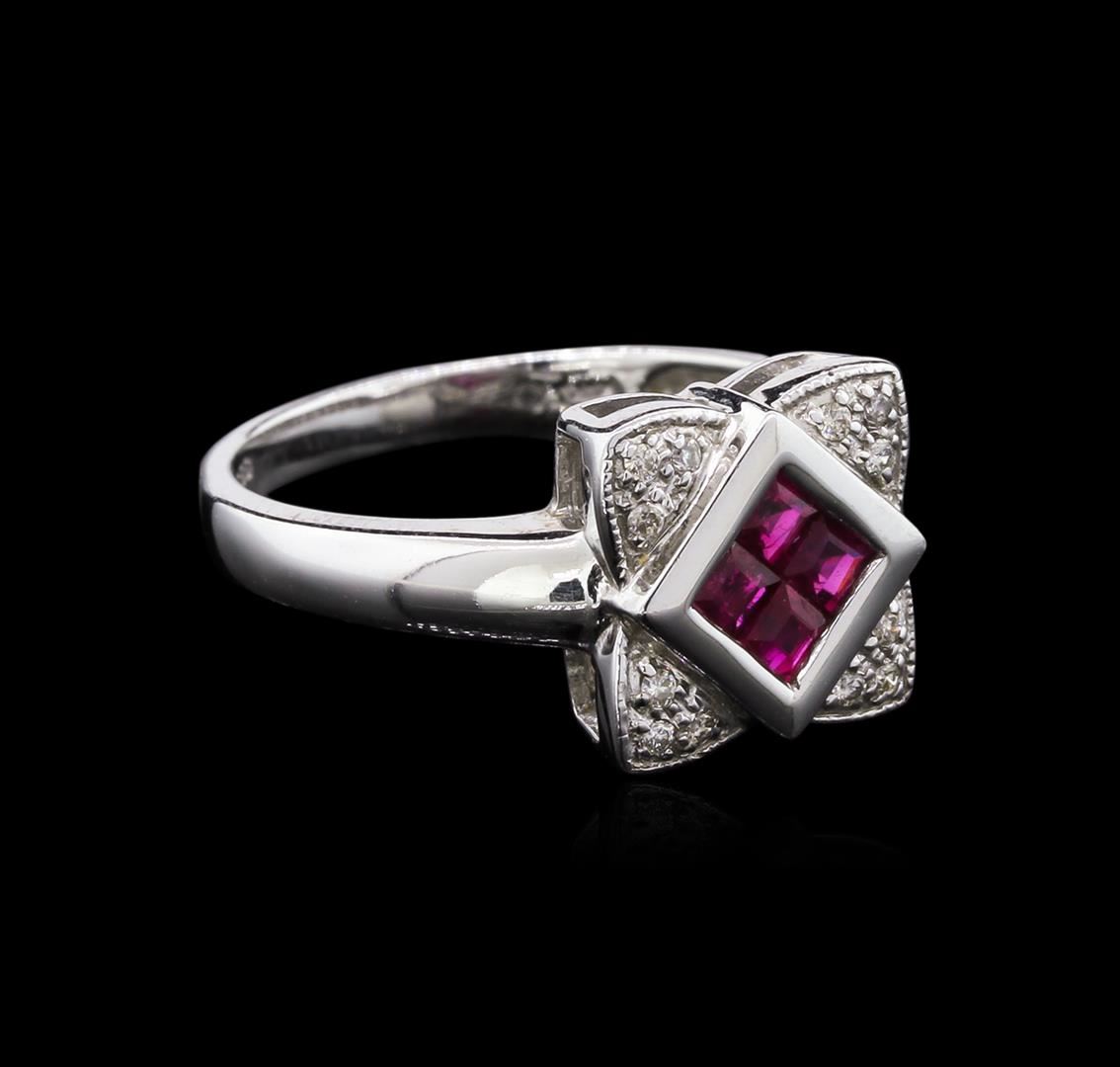 Fourteen karat (14K) white gold ruby and diamond ring. Four (4) square cut ruby corundum gemstone is prong mounted in the center of the ring. Round brilliant cut diamonds accent the ring around the center gemstone. The ring is cast stamped "14K" and has a gross weight of 3.2 Grams. Diamond(s): Shape: Round Brilliant Cut. Weight: 0.12 carat. Average Clarity: I1. Average Color: H-J. Symmetry: Very Good. Polish: Very Good. GemStone(s): Ruby Corundum. Nature: Natural. Shape: Square, Faceted. Quantity: 4, Mounted. Weight: 0.20 carat. Bulge: Visible. Clarity: SI, Type 2. Color: Purplish Red (4/4). Symmetry: Very Good. Color Intensity: Medium. Transparency: Transparent. Tone: Medium. Metal(s): Metal: Gold, Stamped. Purity: 14K. Color: White. Condition: Excellent. Finish: High polish. GGA Appraised at $2,320.00.
