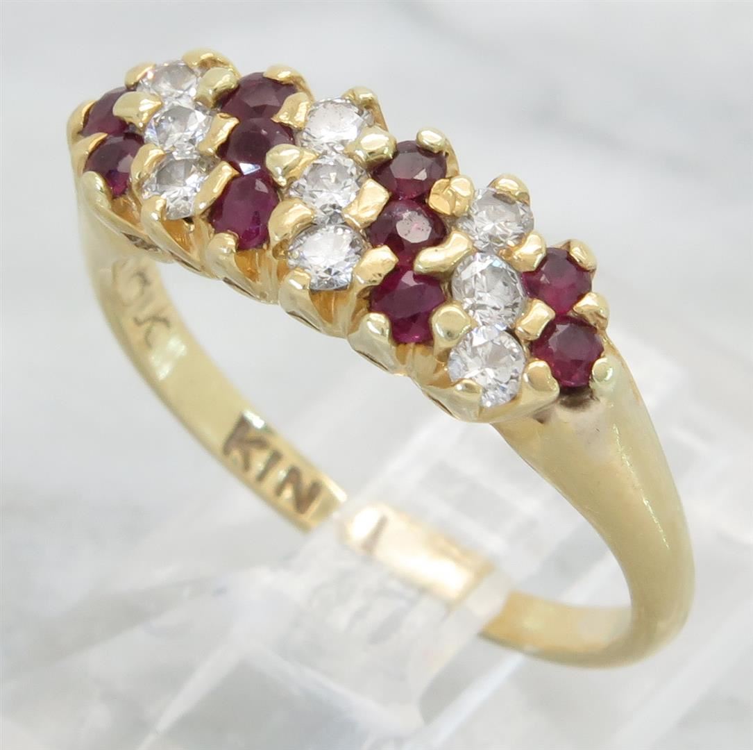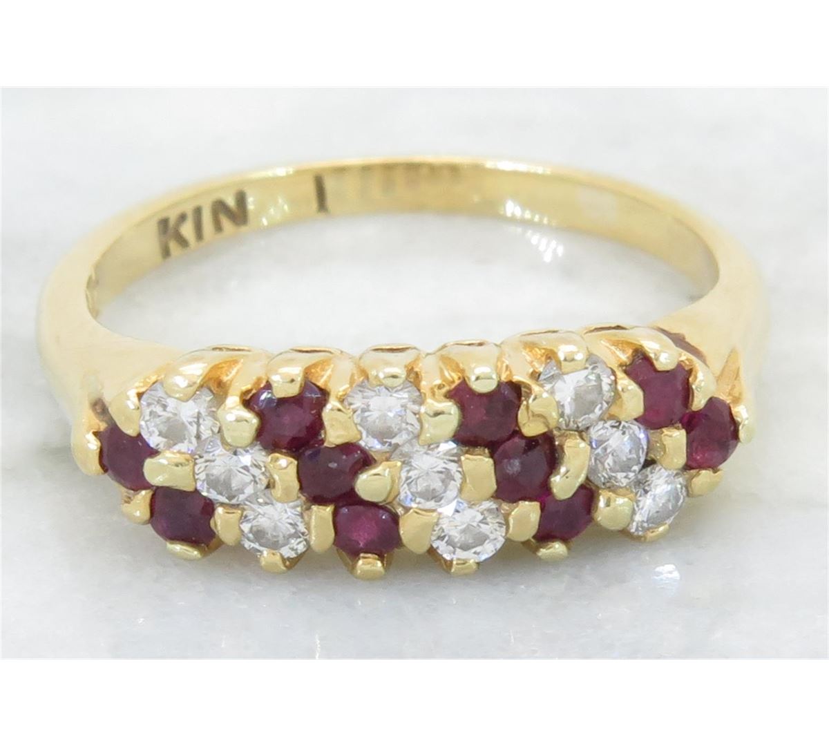 One tested 18K yellow gold diamond and ruby ring. Containing: Nine Round Brilliant Cut Diamonds, 10 rubies. Approximate total ruby Weight: .20CTW, Approximate total diamond weight: .22CTW. Diamonds are graded in the mounting, unless otherwise stated. Weight: 3.3 grams, Size: 5.0.