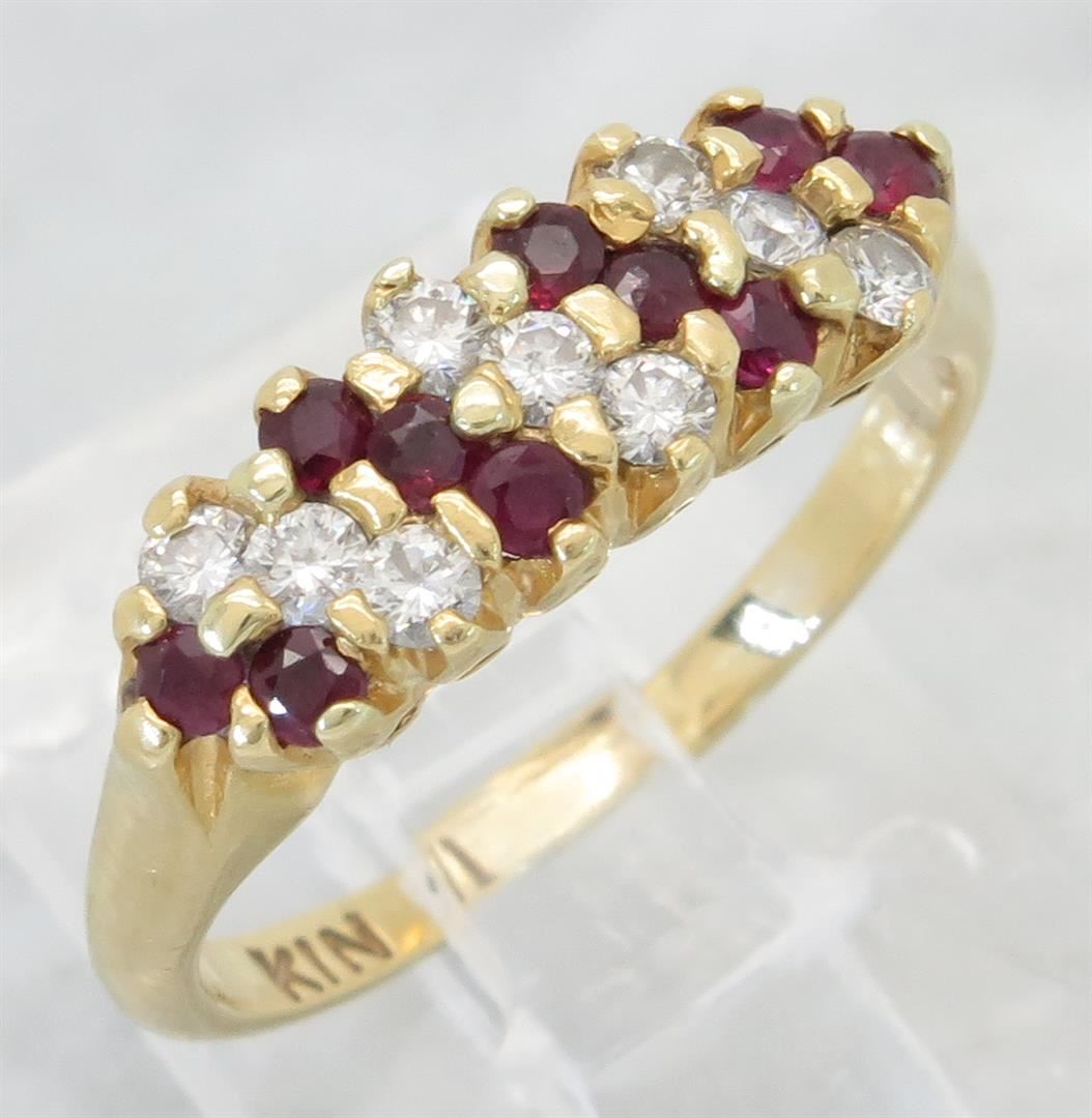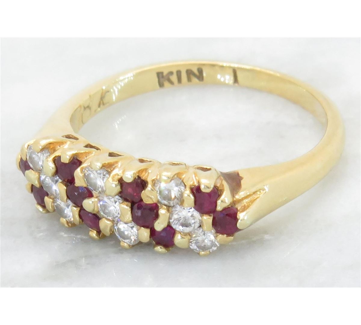 One tested 18K yellow gold diamond and ruby ring. Containing: Nine Round Brilliant Cut Diamonds, 10 rubies. Approximate total ruby Weight: .20CTW, Approximate total diamond weight: .22CTW. Diamonds are graded in the mounting, unless otherwise stated. Weight: 3.3 grams, Size: 5.0.
