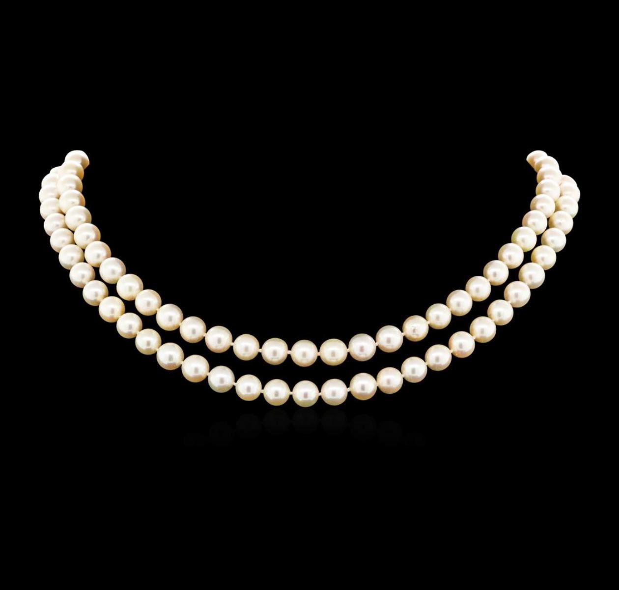 One uniform single strand pearl necklace 36.0' opera length, knotted with a fish hook clasp containing 108 akoya cultured pearls, 8.0mm to 7.5mm in size. The pearls are pink in color, ros� overtone with a very good luster, round, and clean with very goo GAS Appraised.