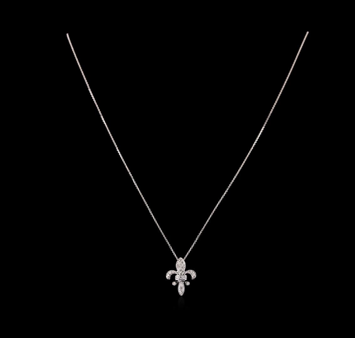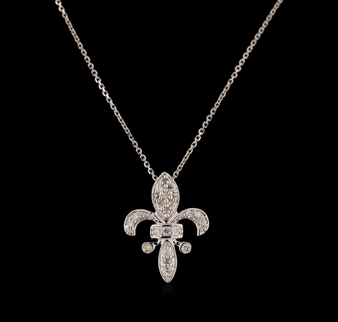One electronically tested 14KT white gold lady's combination cast & assembled fashion pendant & chain 18.0' long, 1mm diamond cut oval cable link with a spring ring clasp with a bright polish finish. The featured lady's pendant and chain has a fleur de lis motif and a drop measuring 16.40 millimeters in length. Identified with markings of '14K'. Condition is new, good workmanship. Containing: Three prong set round brilliant cut diamonds, measuring 1.40 - 1.30 x 0.84mm (depth est.) approximate total weight of 3 Stones = 0.03ct. Graded in the setting. Clarity SI-1 to I-1. Color: G - H Cut Good Two bezel set single cut diamonds, measuring 1.40 - 1.30 x 0.84mm (depth est.) approximate total weight of 2 Stones = 0.02ct. Graded in the setting. Clarity SI-1 to I-1. Color: H - I Cut Good Eighteen prong set single cut diamonds, measuring 1.40 - 1.30 x 0.81mm (depth est.) approximate total weight of 18 Stones = 0.16ct. Graded in the setting. Clarity SI-2 to I-1. Color: H - I Cut Good. Total Weight of Diamonds 0.21ct.. Total Weight of Pendant & Chain 2.10gm. GAS Appraised at $900.00.
