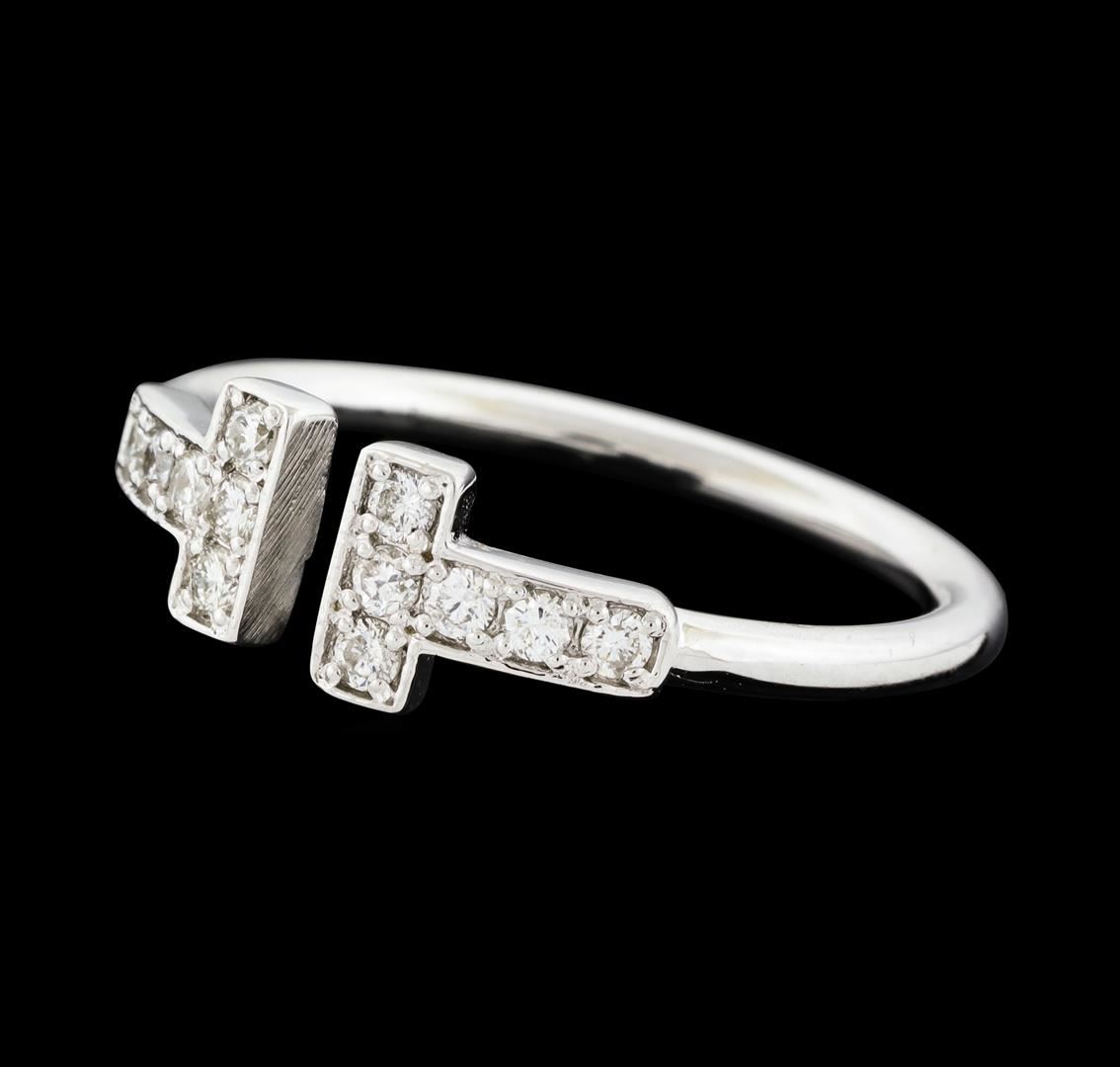 One electronically tested 14KT white gold lady's cast fashion ring with a bright polish finish. The featured lady's ring has double 'T' with negative space motif at the top of the ring and a shank measuring 1.68 millimeters wide. Identified with markings of '14K'. Condition is new, good workmanship. Containing: Twelve prong set round brilliant cut diamonds, measuring 1.70 - 1.65 x 1.02mm (depth est.) approximate total weight of 12 Stones = 0.21ct. Graded in the setting. Clarity SI-1 to SI-2. Color: H - I Cut Good. Total Weight of Diamonds 0.21ct.. Total Weight of Ring 2.30gm. GAS Appraised at $895.00.