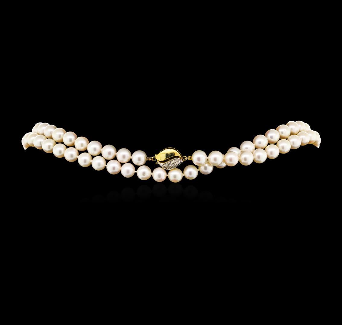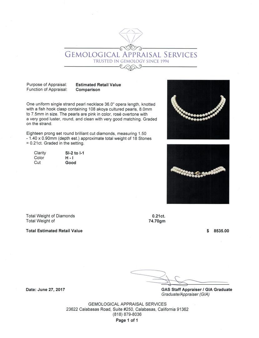 One uniform single strand pearl necklace 36.0' opera length, knotted with a fish hook clasp containing 108 akoya cultured pearls, 8.0mm to 7.5mm in size. The pearls are pink in color, ros� overtone with a very good luster, round, and clean with very good matching. Graded on the strand. Eighteen prong set round brilliant cut diamonds, measuring 1.50 - 1.40 x 0.90mm (depth est.) approximate total weight of 18 Stones = 0.21ct. Graded in the setting. Color H - I Clarity SI-2 to I-1 Cut Good. Total Weight of Diamonds 0.21ct.. Total Weight of 74.70gm GAS Appraised at $8535.00. GAS Appraised at $8,535.00.