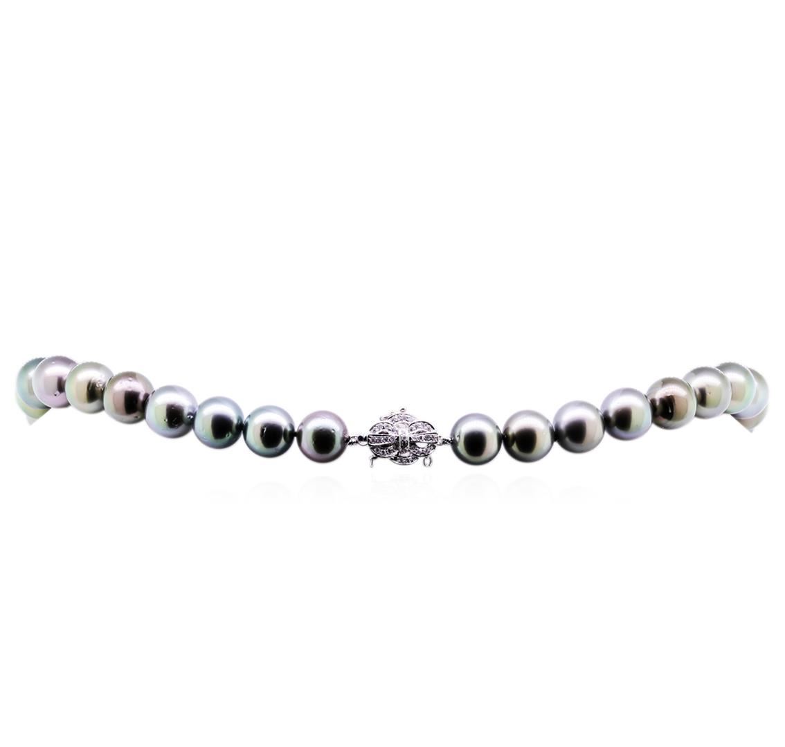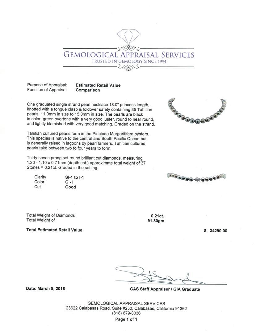 One graduated single strand pearl necklace 18.0" princess length, knotted with a tongue clasp & foldover safety containing 35 Tahitian pearls, 11.0mm in size to 15.0mm in size. The pearls are black in color, green overtone with a very good luster, round to near round, and lightly blemished with very good matching. Graded on the strand. Tahitian cultured pearls form in the Pinctada Margaritifera oysters. This species is native to the central and South Pacific Ocean but is generally raised in lagoons by pearl farmers. Tahitian cultured pearls take between two to four years to form. Thirty-Seven prong set round brilliant cut diamonds, measuring 1.20 - 1.10 x 0.71mm (depth est.) approximate total weight of 37 Stones = 0.21ct. Graded in the setting. Clarity: SI-1 to I-1. Color: G - I. Cut Good. Total Weight of Diamonds 0.21ct. Total Weight of 91.80gm. GAS Appraised at $34,290.00.