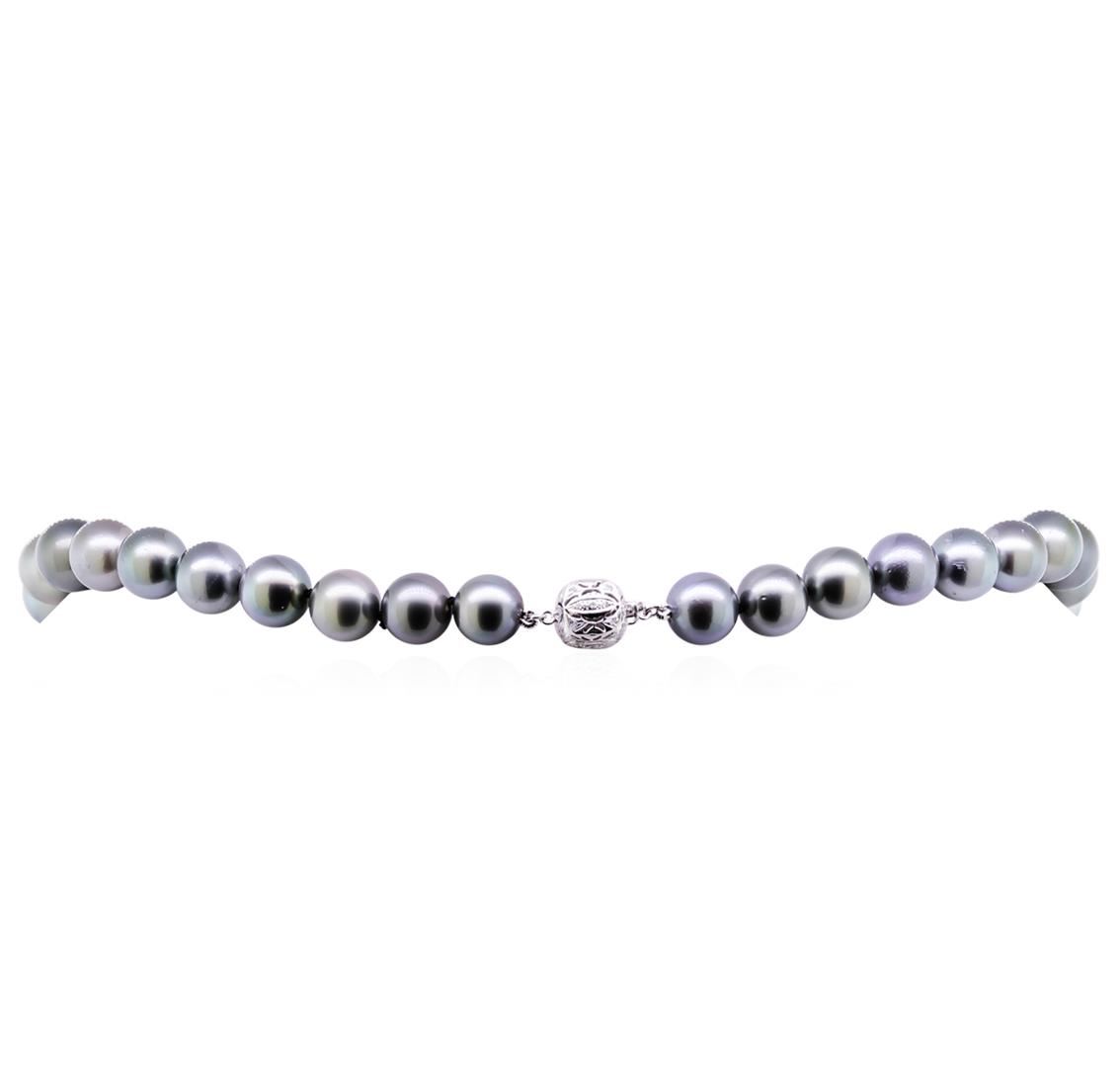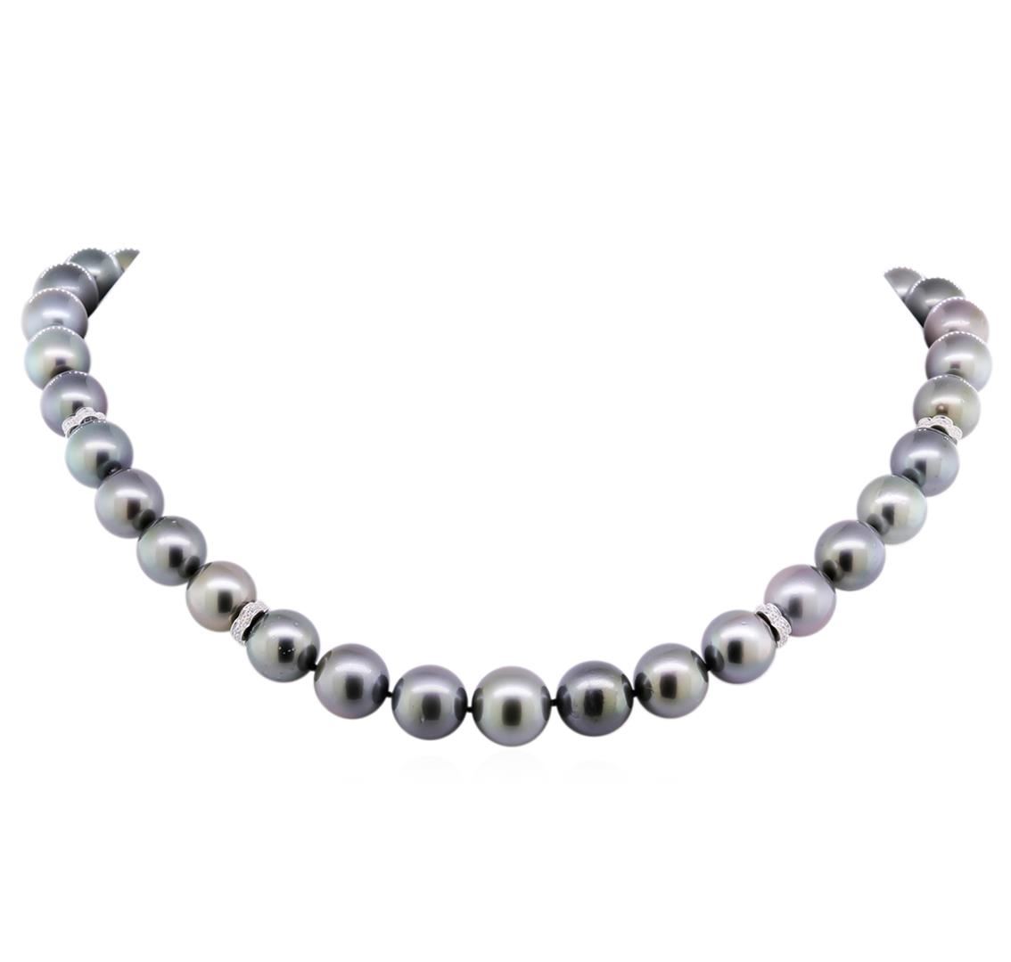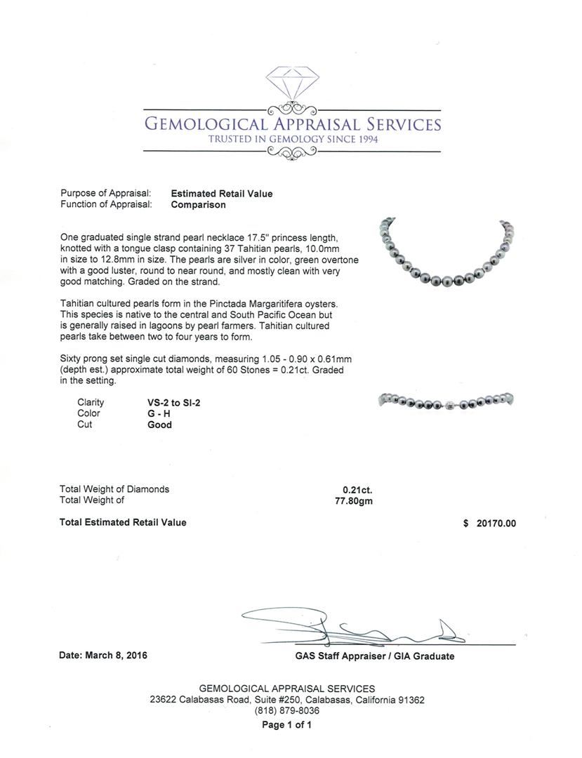 One graduated single strand pearl necklace 17.5" princess length, knotted with a tongue clasp containing 37 Tahitian pearls, 10.0mm in size to 12.8mm in size. The pearls are silver in color, green overtone with a good luster, round to near round, and mostly clean with very good matching. Graded on the strand. Tahitian cultured pearls form in the Pinctada Margaritifera oysters. This species is native to the central and South Pacific Ocean but is generally raised in lagoons by pearl farmers. Tahitian cultured pearls take between two to four years to form. Sixty prong set single cut diamonds, measuring 1.05 - 0.90 x 0.61mm (depth est.) approximate total weight of 60 Stones = 0.21ct. Graded in the setting. Clarity: VS-2 to SI-2. Color: G - Good. Total Weight of Diamonds 0.21ct. Total Weight of 77.80gm. GAS Appraised at $20,170.00.