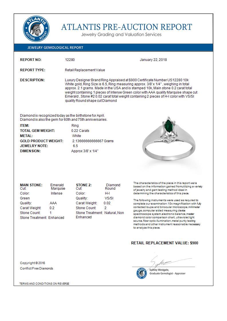 REF-14W2F -12280 ---- 0.22 CTW Emerald & Diamond Ring 10K White Gold ---- Luxury Designer Brand Ring Appraised at $900 Certificate Number US12280 10k White gold, Ring Size is 6.5, Ring measuring approx. 3/8' x 1/4" , weighing in total approx. 2.1 grams. Made in the USA and is stamped 10k, Main stone 0.2 carat total weight containing 1 pieces of Intense Green color with AAA quality Marquise shape cut Emerald , Stone #2 0.02 carat total weight containing 2 pieces of H-I color with VS/SI quality Round shape cut Diamond