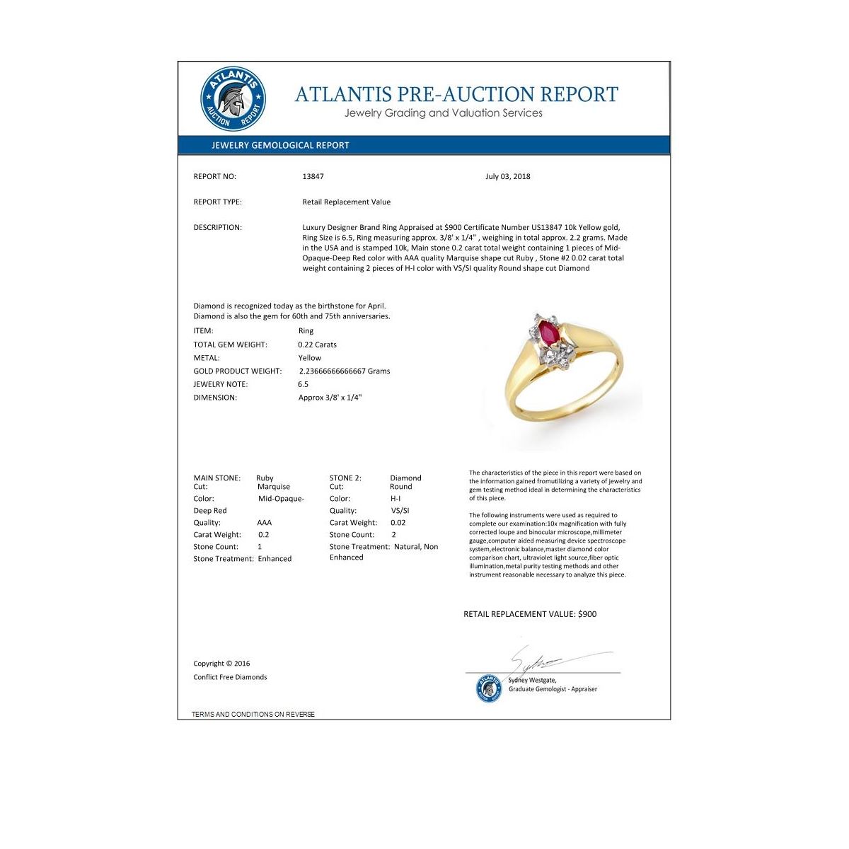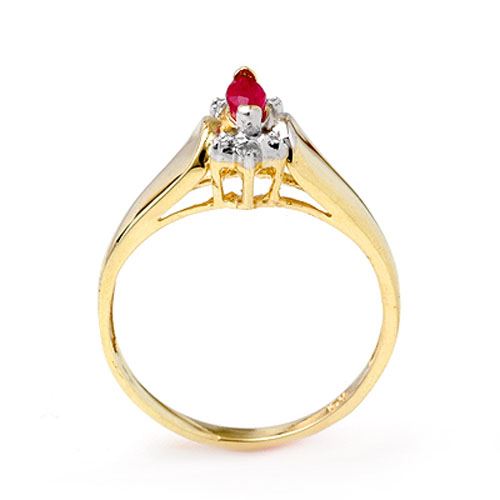 REF-13H3A -13847 ---- 0.22 CTW Ruby & Diamond Ring 10K Yellow Gold ---- Luxury Designer Brand Ring Appraised at $900 Certificate Number US13847 10k Yellow gold, Ring Size is 6.5, Ring measuring approx. 3/8' x 1/4" , weighing in total approx. 2.2 grams. Made in the USA and is stamped 10k, Main stone 0.2 carat total weight containing 1 pieces of Mid-Opaque-Deep Red color with AAA quality Marquise shape cut Ruby , Stone #2 0.02 carat total weight containing 2 pieces of H-I color with VS/SI quality Round shape cut Diamond