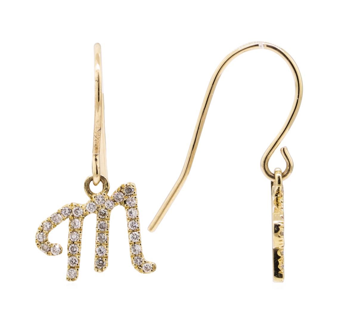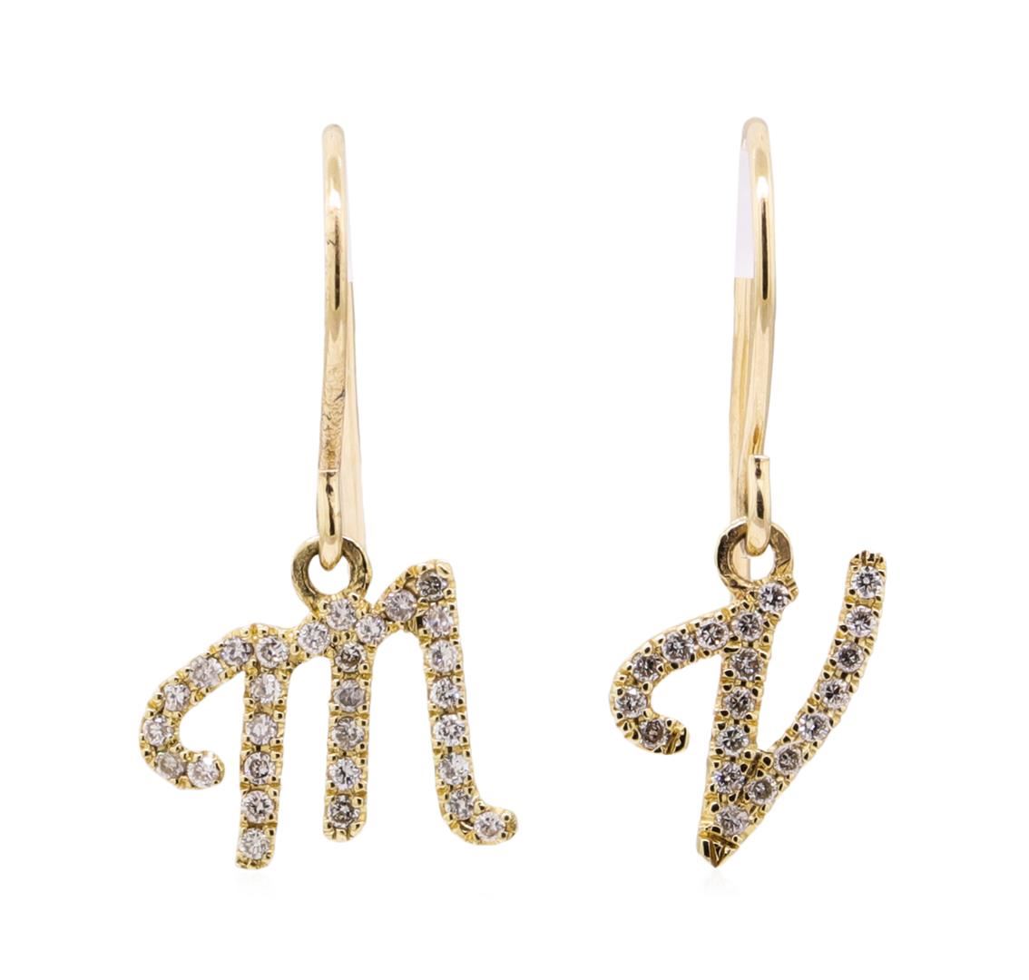 One pair of lady's french wire initial earrings featuring: 14KT yellow gold weighing 1.0 grams containing diamonds weighing 0.22ctw. The earrings are the initials "M" and "V".