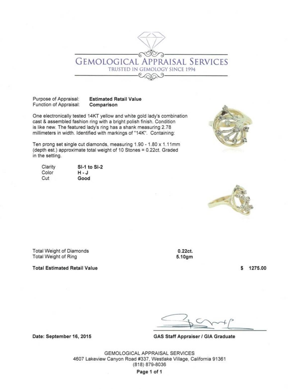 One electronically tested 14KT yellow and white gold lady's combination cast & assembled fashion ring with a bright polish finish. The featured lady's ring has a shank measuring 2.78 millimeters in width. Identified with markings of "14K". Condition is like new. Containing: Ten prong set single cut diamonds, measuring 1.90 - 1.80 x 1.11mm (depth est.) approximate total weight of 10 Stones = 0.22ct. Graded in the setting. Clarity: SI-1 to SI-2. Color: H - Good. Total Weight of Diamonds 0.22ct. Total Weight of Ring 5.10gm. GAS Appraised.