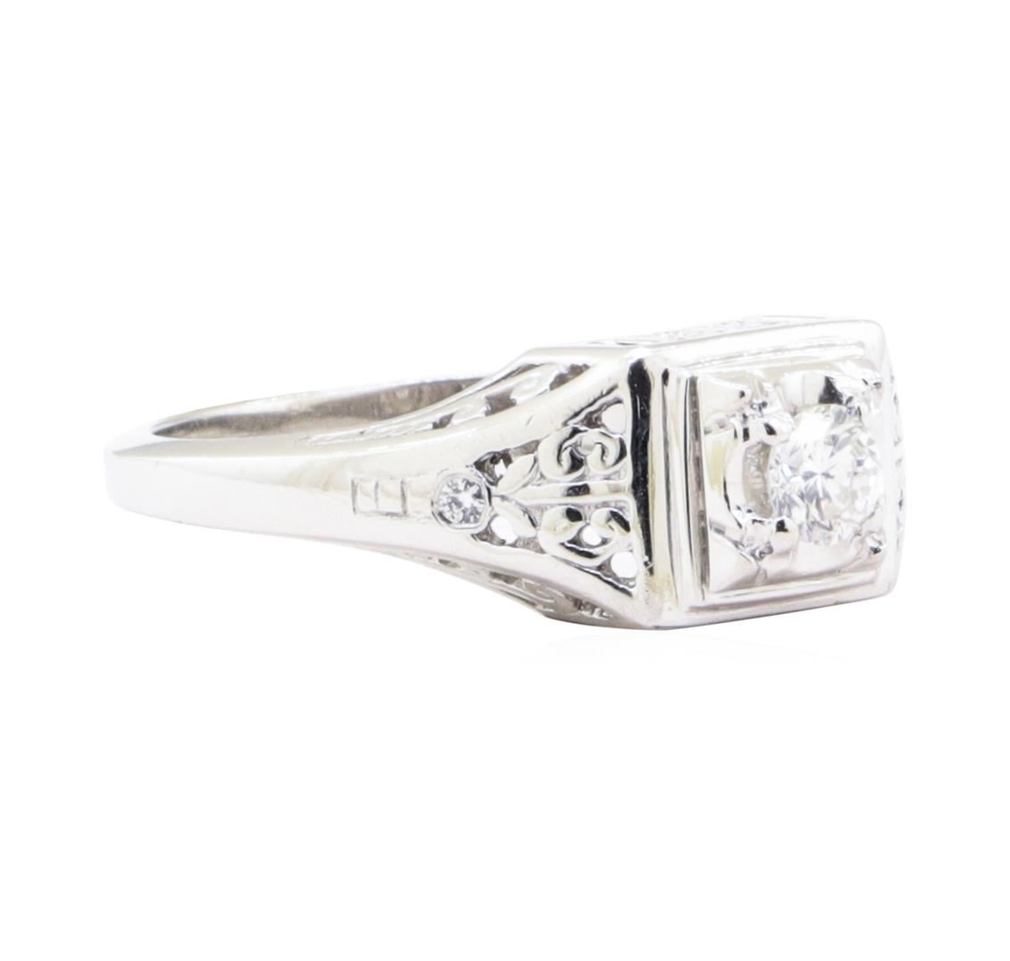 One electronically tested platinum lady's cast vintage style wedding ring with a tapered cathedral shank with a bright polish with filigree detailing finish. The featured lady's ring has a shank measuring 1.80 millimeters wide. Identified with markings of 'PT 950'. Condition is new, good workmanship. Containing: One prong set round brilliant cut diamond, measuring 3.70 - 3.65 x 2.28mm (depth est.) approximate weight of 0.20ct. Graded in the setting. Color G Clarity SI-1 Cut Very Good Two bezel set round brilliant cut diamonds, measuring 1.50 - 1.45 x 0.92mm (depth est.) approximate total weight of 2 Stones = 0.02ct. Graded in the setting. Color G - H Clarity VS-2 to SI-1 Cut Very Good. Total Weight of Diamonds 0.22ct.. Total Weight of Ring 8.20gm GAS Appraised at $2190.00. GAS Appraised.