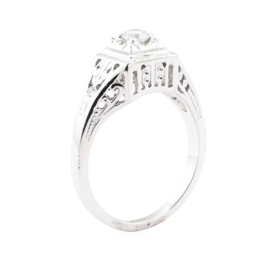 One electronically tested platinum lady's cast vintage style wedding ring with a tapered cathedral shank with a bright polish with filigree detailing finish. The featured lady's ring has a shank measuring 1.80 millimeters wide. Identified with markings of 'PT 950'. Condition is new, good workmanship. Containing: One prong set round brilliant cut diamond, measuring 3.70 - 3.65 x 2.28mm (depth est.) approximate weight of 0.20ct. Graded in the setting. Color G Clarity SI-1 Cut Very Good Two bezel set round brilliant cut diamonds, measuring 1.50 - 1.45 x 0.92mm (depth est.) approximate total weight of 2 Stones = 0.02ct. Graded in the setting. Color G - H Clarity VS-2 to SI-1 Cut Very Good. Total Weight of Diamonds 0.22ct.. Total Weight of Ring 8.20gm GAS Appraised at $2190.00. GAS Appraised.