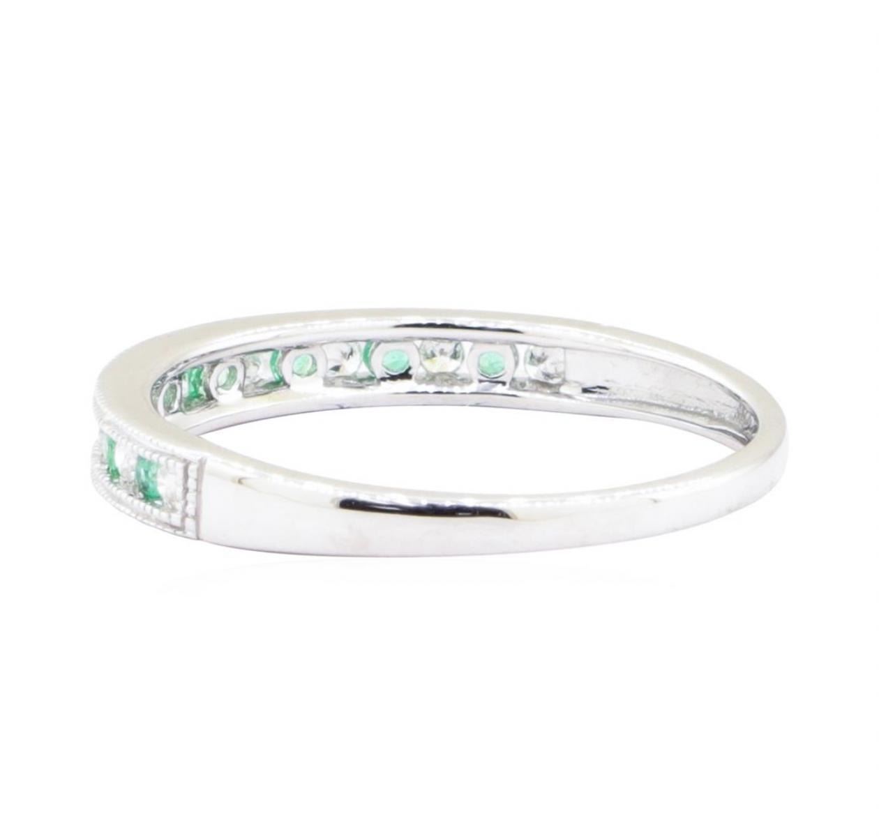 One straight-line double milgrain band featuring: 10KT white gold weighing 1.5 grams containing emeralds and diamonds weighing 0.22ctw.
