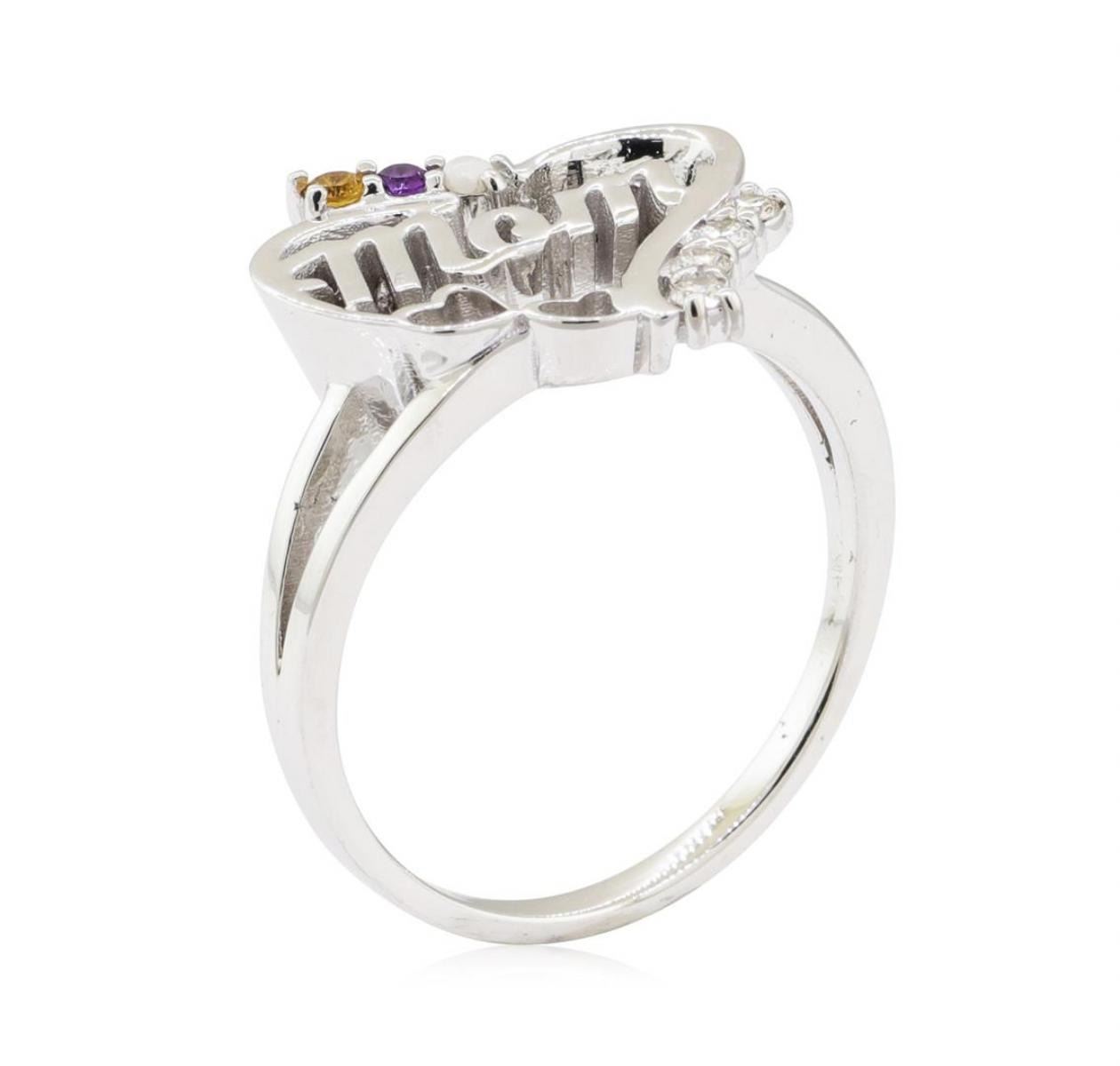 One ring featuring: 14KT white gold weighing 6.3 grams containing diamonds weighing 0.12ctw and three birthstones weighing 0.10ctw. The ring has a heart motif with the word "Mom".