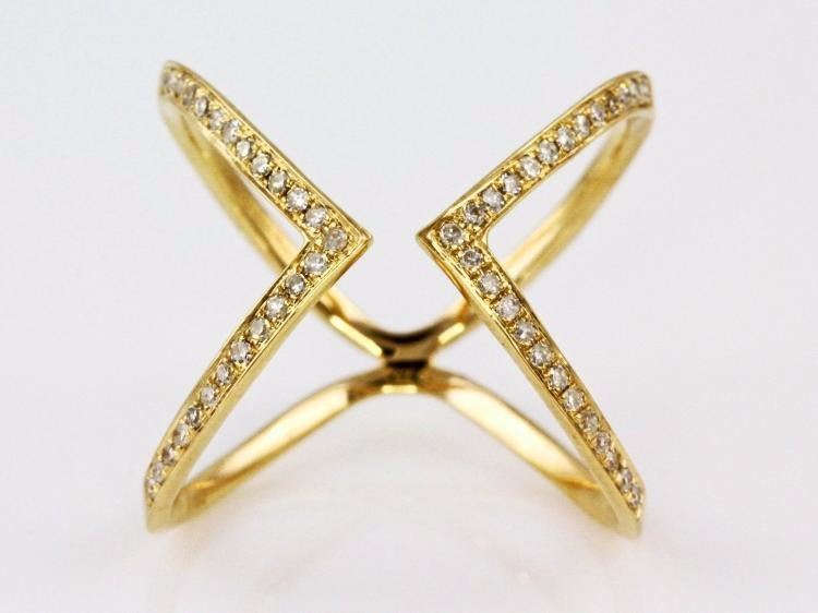 |**Total Carat Weight:0.28|**Clarity:Si2-Si3|**Cut:Verry Good|**Setting:Micro Pave Set|**Main Stone:|**MAIN Stone Treatment:Not Enhanced|**Main Stone Color:|**Main Stone Color:Round|**Theme:|**Length Inches:|**Ring Size:7|**Style:Band|**Metal Purity:14k|**Metal:Yellow Gold|**Gold Weight:2.50g|**Dimension:|**Diamond Color:G-H|**Sizable:Yes|**Condition A brand-new, unused, and unworn item (including handmade items) in the original packaging (such as the original box or bag) and/or with the original tags attached|**Remarks: Colorless Diamonds, With no visible inclusions to the unaided eye. 0.22ct - 50pcs. - 0.7mm - Round Diamonds (Not Enhanced) SETTING: Micro Pave Set RING FACE: 19mm x 19mm Approx.BAND WIDTH: 1.7mm.DESIGN: Pave Chevron X Cuff WEIGHT OF GOLD: 2.50g 14K Solid Yellow Gold - ("14K" Metal Stamp)