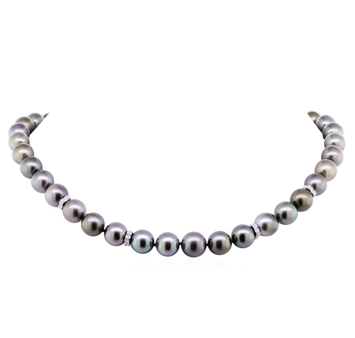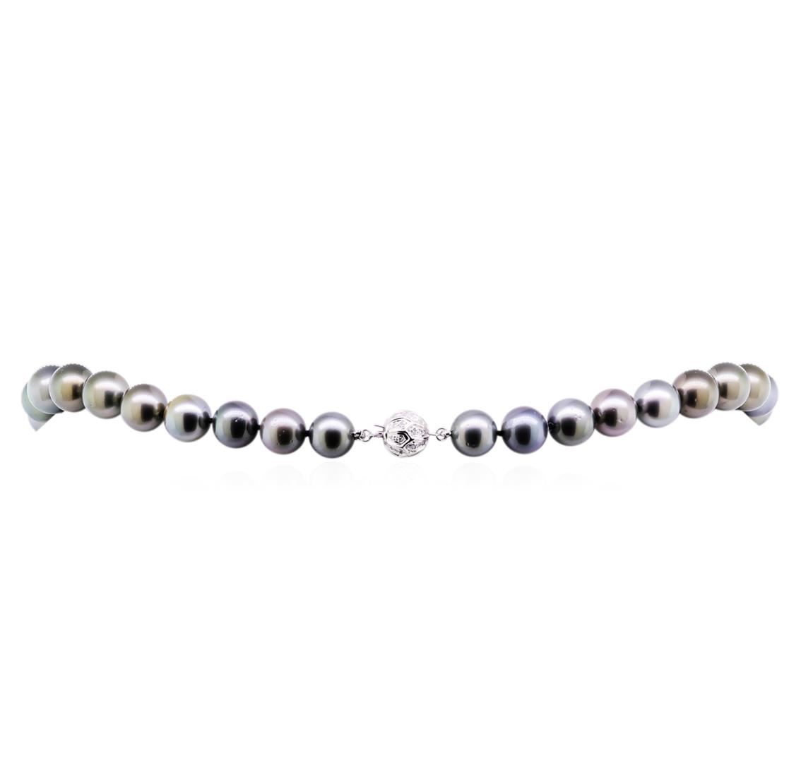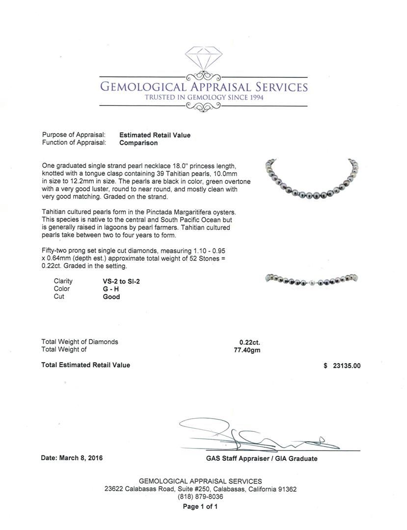 One graduated single strand pearl necklace 18.0" princess length, knotted with a tongue clasp containing 39 Tahitian pearls, 10.0mm in size to 12.2mm in size. The pearls are black in color, green overtone with a very good luster, round to near round, and mostly clean with very good matching. Graded on the strand. Tahitian cultured pearls form in the Pinctada Margaritifera oysters. This species is native to the central and South Pacific Ocean but is generally raised in lagoons by pearl farmers. Tahitian cultured pearls take between two to four years to form. Fifty-Two prong set single cut diamonds, measuring 1.10 - 0.95 x 0.64mm (depth est.) approximate total weight of 52 Stones = 0.22ct. Graded in the setting. Clarity: VS-2 to SI-2. Color: G - Good. Total Weight of Diamonds 0.22ct. Total Weight of 77.40gm. GAS Appraised at $23,135.00.