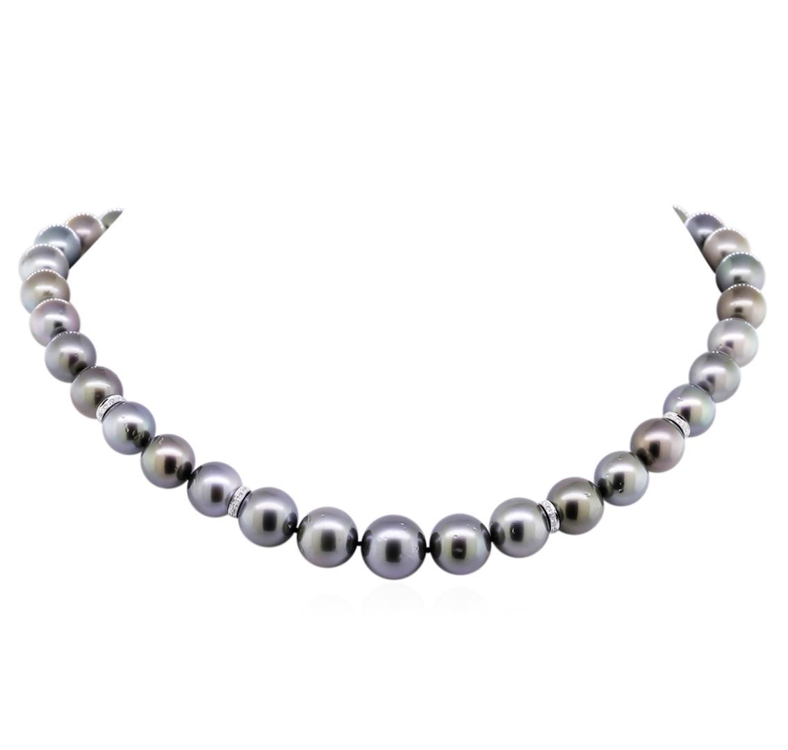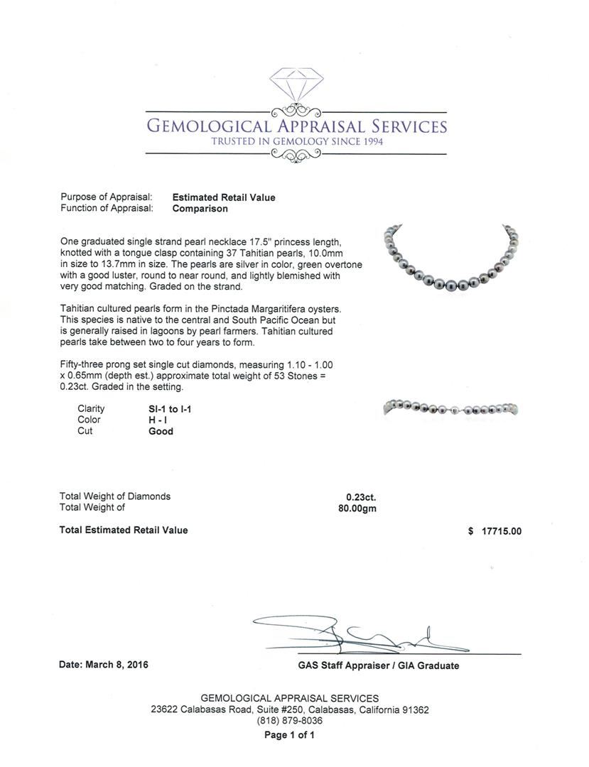 One graduated single strand pearl necklace 17.5" princess length, knotted with a tongue clasp containing 37 Tahitian pearls, 10.0mm in size to 13.7mm in size. The pearls are silver in color, green overtone with a good luster, round to near round, and lightly blemished with very good matching. Graded on the strand. Tahitian cultured pearls form in the Pinctada Margaritifera oysters. This species is native to the central and South Pacific Ocean but is generally raised in lagoons by pearl farmers. Tahitian cultured pearls take between two to four years to form. Fifty-Three prong set single cut diamonds, measuring 1.10 - 1.00 x 0.65mm (depth est.) approximate total weight of 53 Stones = 0.23ct. Graded in the setting. Clarity: SI-1 to I-1. Color: H - I. Cut Good. Total Weight of Diamonds 0.23ct. Total Weight of 80.00gm. GAS Appraised at $17,715.00.