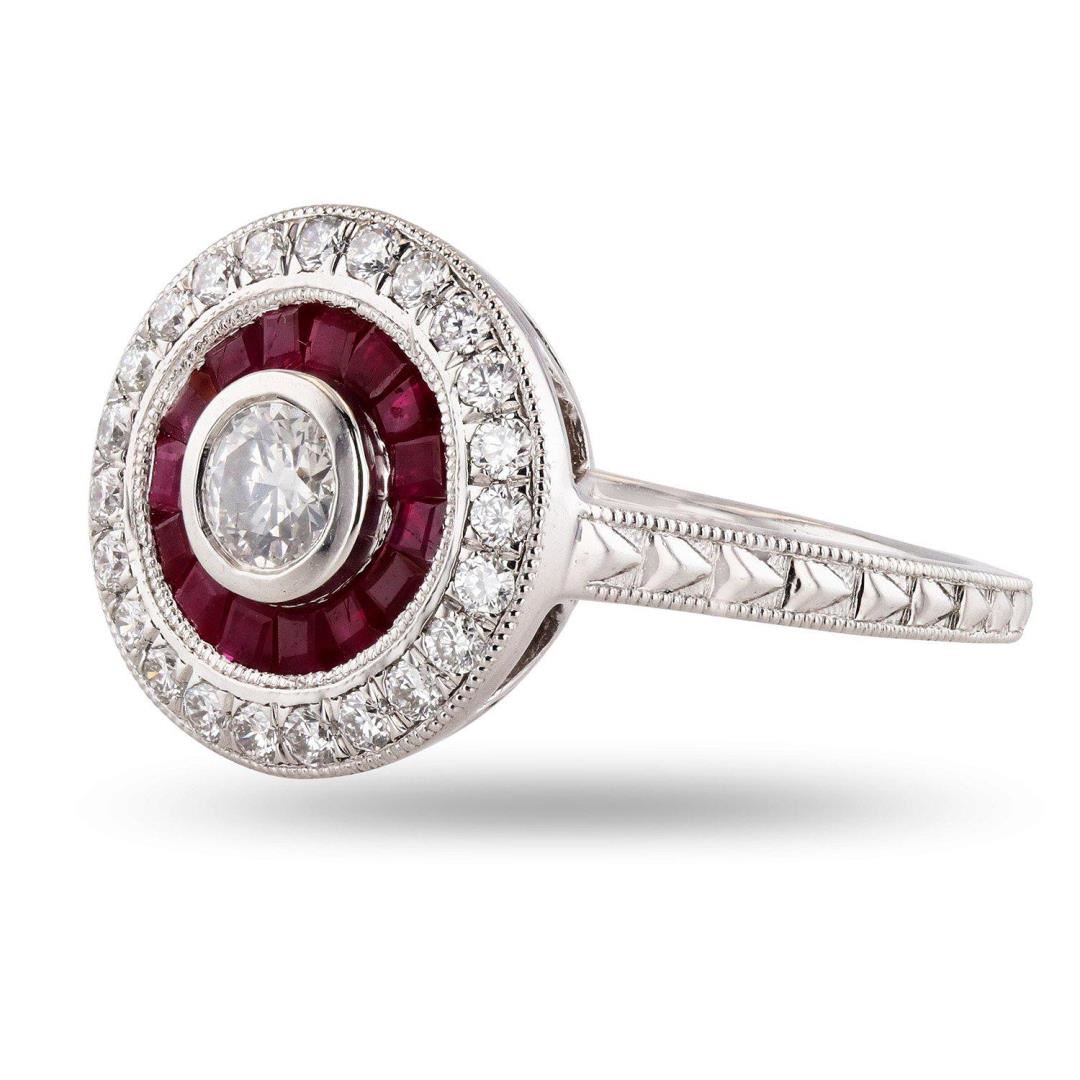 DESCRIPTION: ONE PLATINUM LADY'S CUSTOM MADE DIAMOND & RUBY RING. 7.40 GR TW. 1- MAIN CENTER GEMSTONE(S) IDENTITY : ONE CENTER DIAMOND SET IN BEZEL SETTING STYLE. CARAT WEIGHT : 0.24 CT. SHAPE & MEASUREMEMT : ROUND BRILLIANT CUT. APPROX : 4.00 MM. QUALITY : VS2 CLARITY, H/I COLOR. 2 â€" ADJACENT GEMSTONES : IDENTITY : NATURAL DIAMONDS & BLUE SAPPHIRE. SHAPE : ROUND BRILLIANT CUT & SQUARE CUT. CARAT WEIGHT : 0.31 CTW ROUND CUT DIAMONDS & 0.89 CTS TW RUBY. QUALITY : H COLOR, VS/SI1 CLARITY. ALL FINE CUTTING AND PROPORTIONS. ALL PRONGS & CHANNEL SETTINGS STYLE . TOTAL GEMSTONES WEIGHT : 1.44 CTW TW. Size: 6 3/4