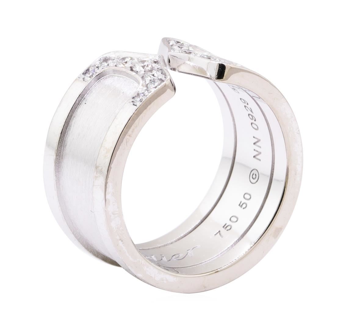 One electronically tested 18KT white gold lady's combination cast & assembled fashion designer band with a wide 'c' motif band with a bright polish and satin finish. The featured lady's ring is from the C de Cartier collection and has a shank measuring 10.00 millimeters wide. The ring is engraved with reference number NN 0929. Trademark is Cartier. Identified with markings of '750'. Condition is used, good workmanship. Containing: Fourteen bead set round brilliant cut diamonds, measuring 2.00 - 1.30 x 1.02mm (depth est.) approximate total weight of 14 Stones = 0.24ct. Graded in the setting. Color F - G Clarity VS-1 to VS-2 Cut Excellent. Total Weight of Diamonds 0.24ct.. Total Weight of Band 11.80gm GAS Appraised at $4900.00. GAS Appraised at $4,900.00.