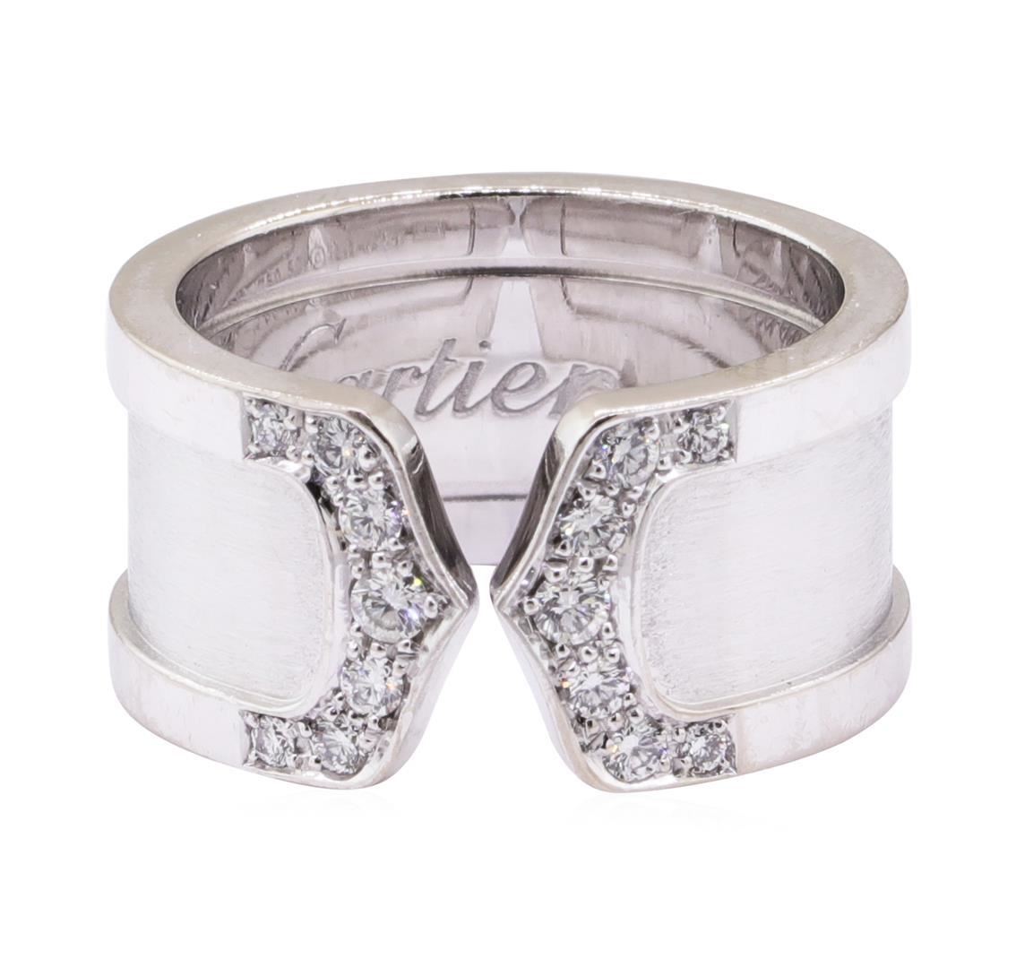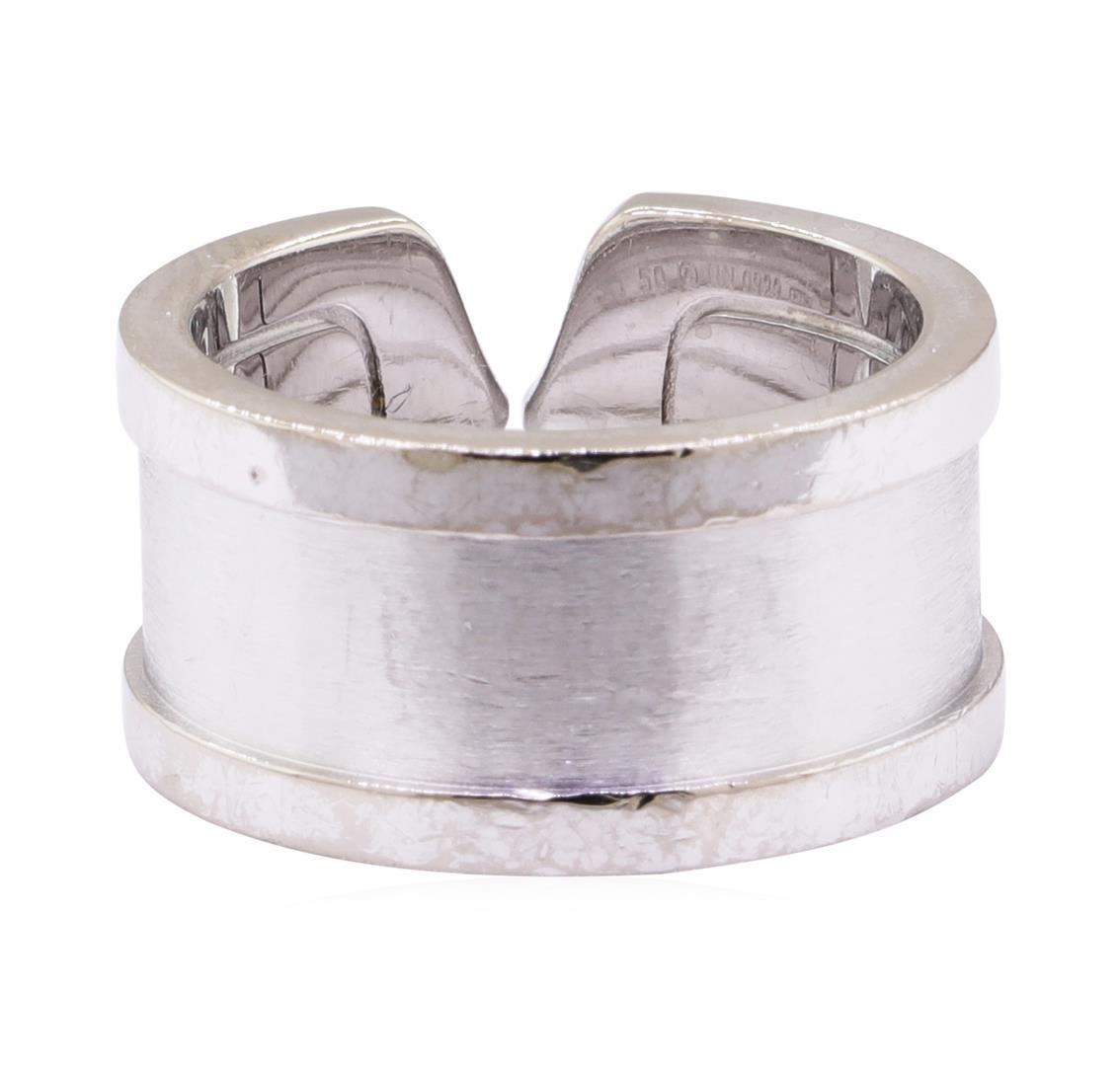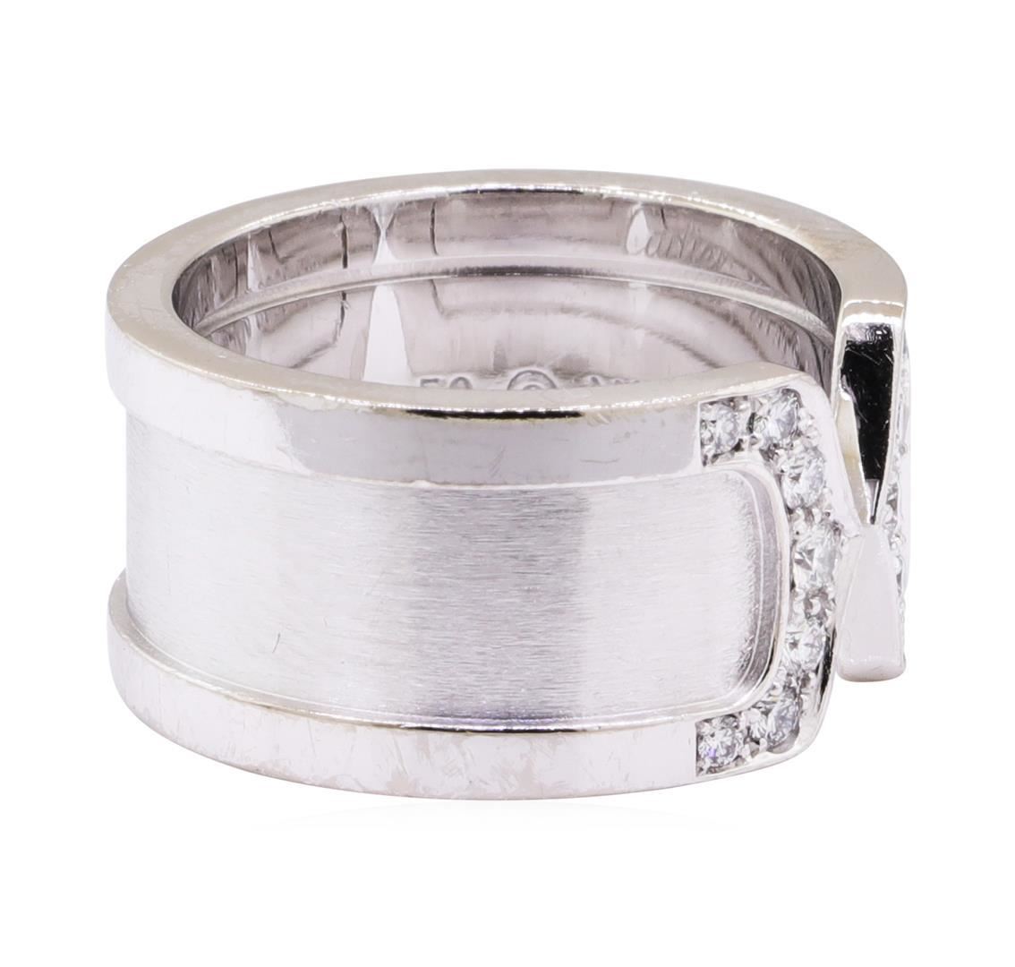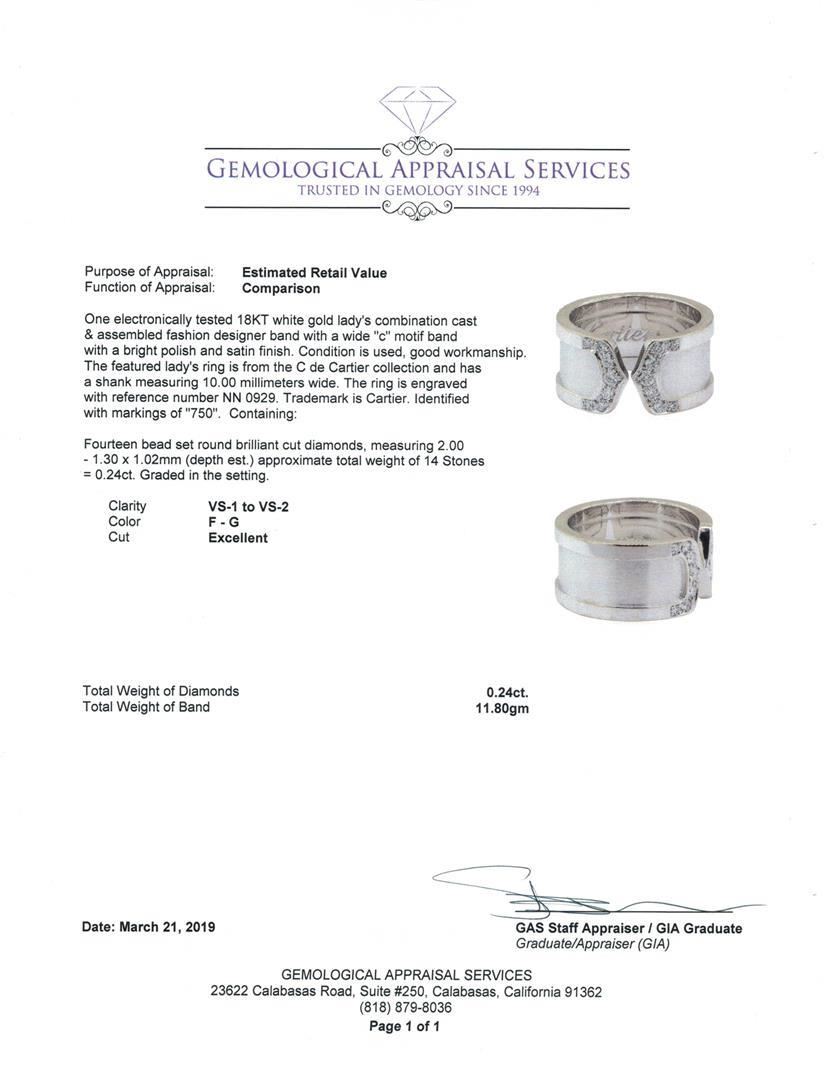 One electronically tested 18KT white gold lady's combination cast & assembled fashion designer band with a wide 'c' motif band with a bright polish and satin finish. The featured lady's ring is from the C de Cartier collection and has a shank measuring 10.00 millimeters wide. The ring is engraved with reference number NN 0929. Trademark is Cartier. Identified with markings of '750'. Condition is used, good workmanship. Containing: Fourteen bead set round brilliant cut diamonds, measuring 2.00 - 1.30 x 1.02mm (depth est.) approximate total weight of 14 Stones = 0.24ct. Graded in the setting. Color F - G Clarity VS-1 to VS-2 Cut Excellent. Total Weight of Diamonds 0.24ct.. Total Weight of Band 11.80gm GAS Appraised at $4900.00. GAS Appraised.