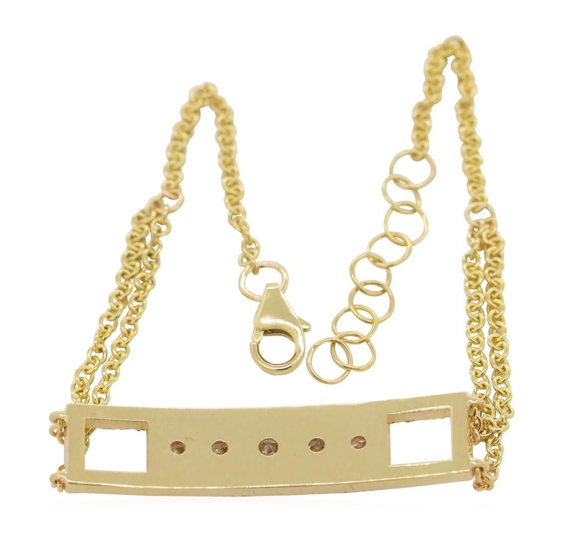 One electronically tested 14KT yellow gold lady's combination cast & assembled fashion bracelet with a lobster claw clasp with a bright polish finish. This featured lady's bracelet can be adjusted from six and a quarter to seven inches in length. Identified with markings of '585'. Condition is new, good workmanship. Containing: One prong set round brilliant cut diamond, measuring 4.20 - 4.18 x 2.21mm (depth est.) approximate weight of 0.24ct. Graded in the setting. Color H Clarity I-1 Cut Good Four prong set round brilliant cut diamonds, measuring 3.15 - 3.10 x 1.94mm (depth est.) approximate total weight of 4 Stones = 0.46ct. Graded in the setting. Color H - I Clarity SI-2 to I-1 Cut Good Fifty prong set round brilliant cut diamonds, measuring 1.10 - 1.00 x 0.65mm (depth est.) approximate total weight of 50 Stones = 0.22ct. Graded in the setting. Color H - I Clarity SI-1 to SI-2 Cut Good. Total Weight of Diamonds 0.92ct.. Total Weight of Bracelet 4.10gm GAS Appraised at $3145.00. GAS Appraised.