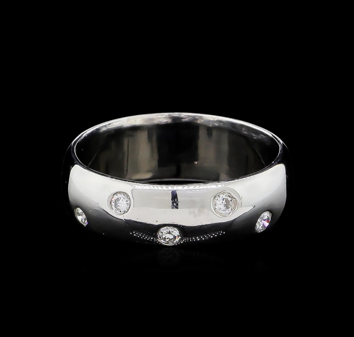 One electronically tested platinum cast diamond ring with a bright polish finish. Six and one-half millimeter wide band features five flush set round brilliant diamonds. Identified with markings of "PT950". Condition is good. Containing: Five flush set round brilliant cut diamonds, measuring 2.20 - 2.10 x 1.29mm (depth est.) approximate total weight of 5 Stones = 0.24ct. Graded in the setting. Clarity: VS-2 to SI-1. Color: G - H. Total Weight of Diamonds 0.24ct. Total Weight of Ring 12.03gm. AIG Appraised at $3,375.00.
