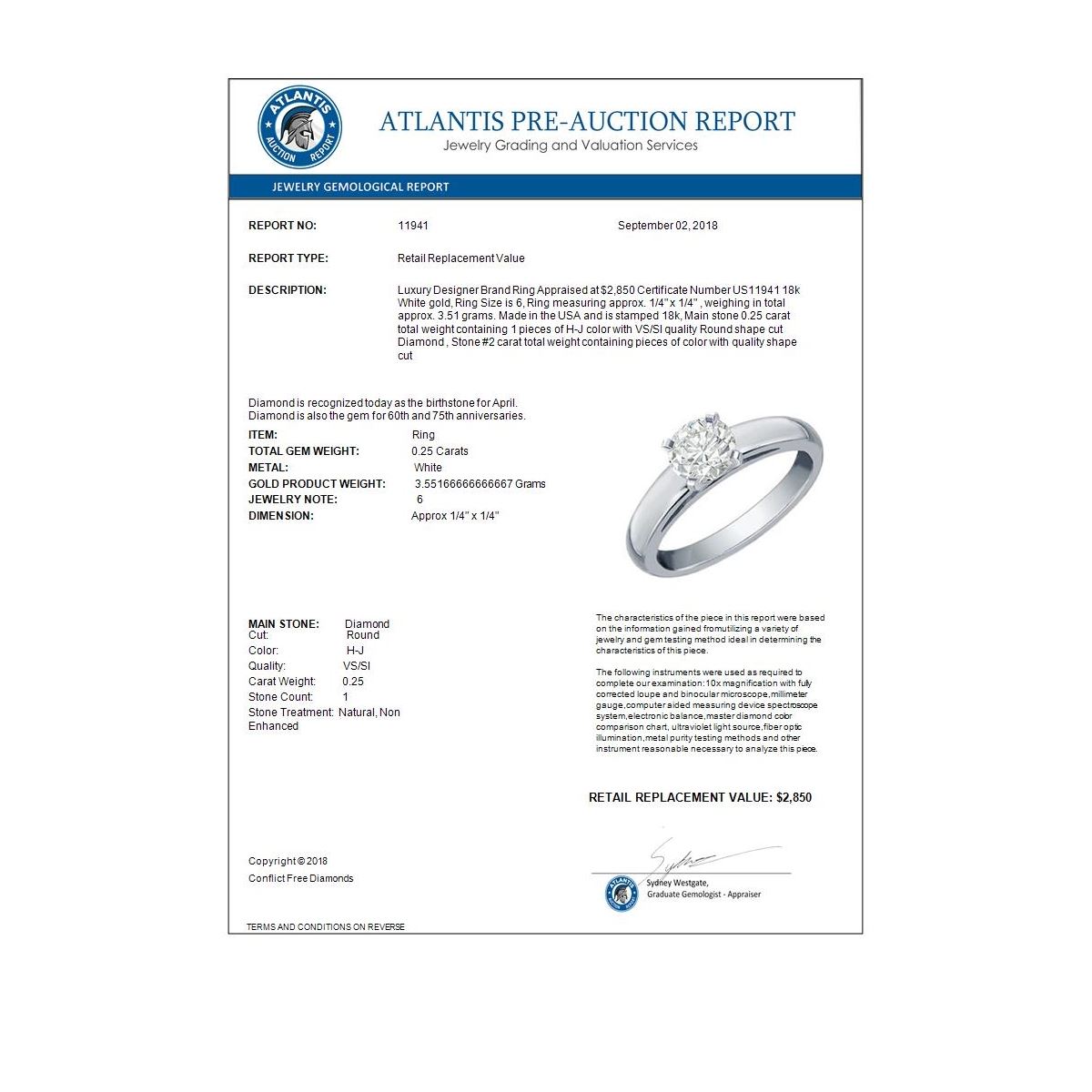 REF-57W3F -11941 ---- 0.25 CTW Certified VS/SI Diamond Solitaire Ring 18K White Gold ---- Luxury Designer Brand Ring Appraised at $2,850 Certificate Number US11941 18k White gold, Ring Size is 6, Ring measuring approx. 1/4" x 1/4" , weighing in total approx. 3.51 grams. Made in the USA and is stamped 18k, Main stone 0.25 carat total weight containing 1 pieces of H-J color with VS/SI quality Round shape cut Diamond , Stone #2 carat total weight containing pieces of color with quality shape cut