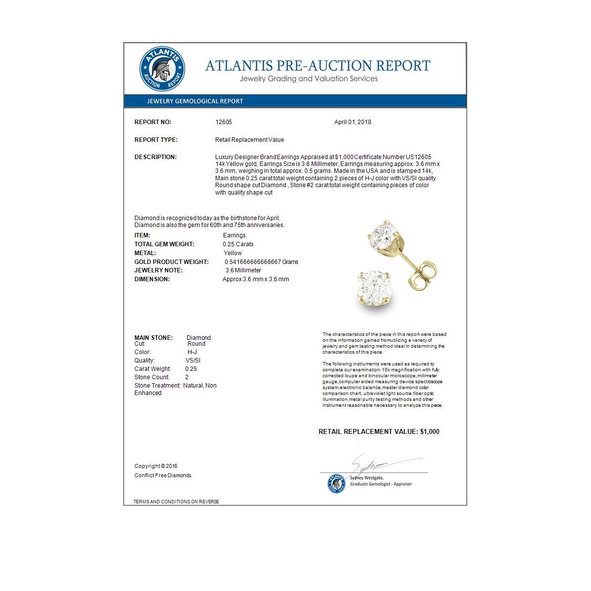 REF-22W8F -12605 ---- 0.25 CTW Certified VS/SI Diamond Solitaire Stud Earrings 14K Yellow Gold ---- Luxury Designer Brand Earrings Appraised at $1,000 Certificate Number US12605 14k Yellow gold, Earrings Size is 3.6 Millimeter, Earrings measuring approx. 3.6 mm x 3.6 mm, weighing in total approx. 0.5 grams. Made in the USA and is stamped 14k, Main stone 0.25 carat total weight containing 2 pieces of H-J color with VS/SI quality Round shape cut Diamond , Stone #2 carat total weight containing pieces of color with quality shape cut