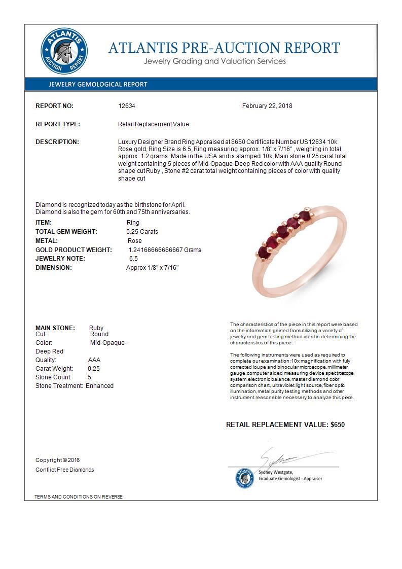 REF-9K8W -12634 ---- 0.25 CTW Ruby Ring 10K Rose Gold ---- Luxury Designer Brand Ring Appraised at $650 Certificate Number US12634 10k Rose gold, Ring Size is 6.5, Ring measuring approx. 1/8" x 7/16" , weighing in total approx. 1.2 grams. Made in the USA and is stamped 10k, Main stone 0.25 carat total weight containing 5 pieces of Mid-Opaque-Deep Red color with AAA quality Round shape cut Ruby , Stone #2 carat total weight containing pieces of color with quality shape cut