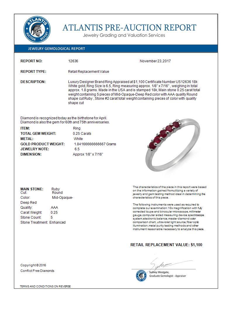 REF-16N8Y -12636 ---- 0.25 CTW Ruby Ring 18K White Gold ---- Luxury Designer Brand Ring Appraised at $1,100 Certificate Number US12636 18k White gold, Ring Size is 6.5, Ring measuring approx. 1/8" x 7/16" , weighing in total approx. 1.8 grams. Made in the USA and is stamped 18k, Main stone 0.25 carat total weight containing 5 pieces of Mid-Opaque-Deep Red color with AAA quality Round shape cut Ruby , Stone #2 carat total weight containing pieces of color with quality shape cut