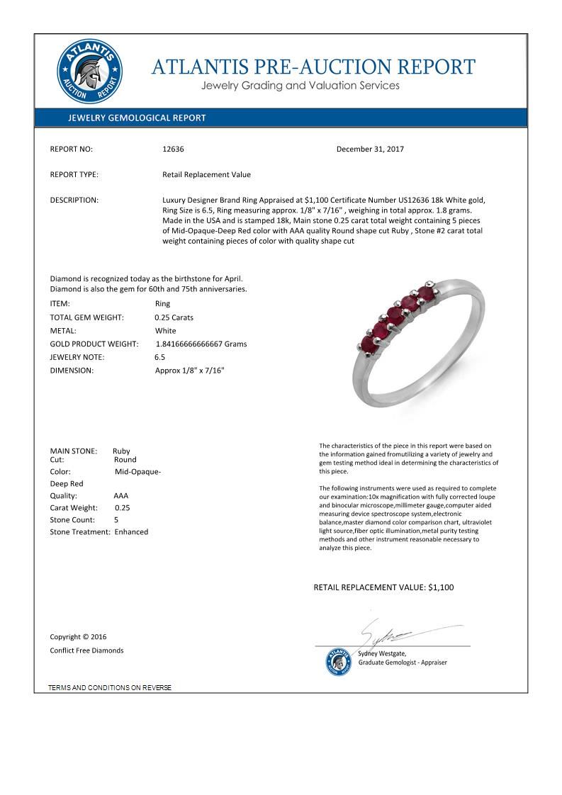 REF-16N8Y -12636 ---- 0.25 CTW Ruby Ring 18K White Gold ---- Luxury Designer Brand Ring Appraised at $1,100 Certificate Number US12636 18k White gold, Ring Size is 6.5, Ring measuring approx. 1/8" x 7/16" , weighing in total approx. 1.8 grams. Made in the USA and is stamped 18k, Main stone 0.25 carat total weight containing 5 pieces of Mid-Opaque-Deep Red color with AAA quality Round shape cut Ruby , Stone #2 carat total weight containing pieces of color with quality shape cut