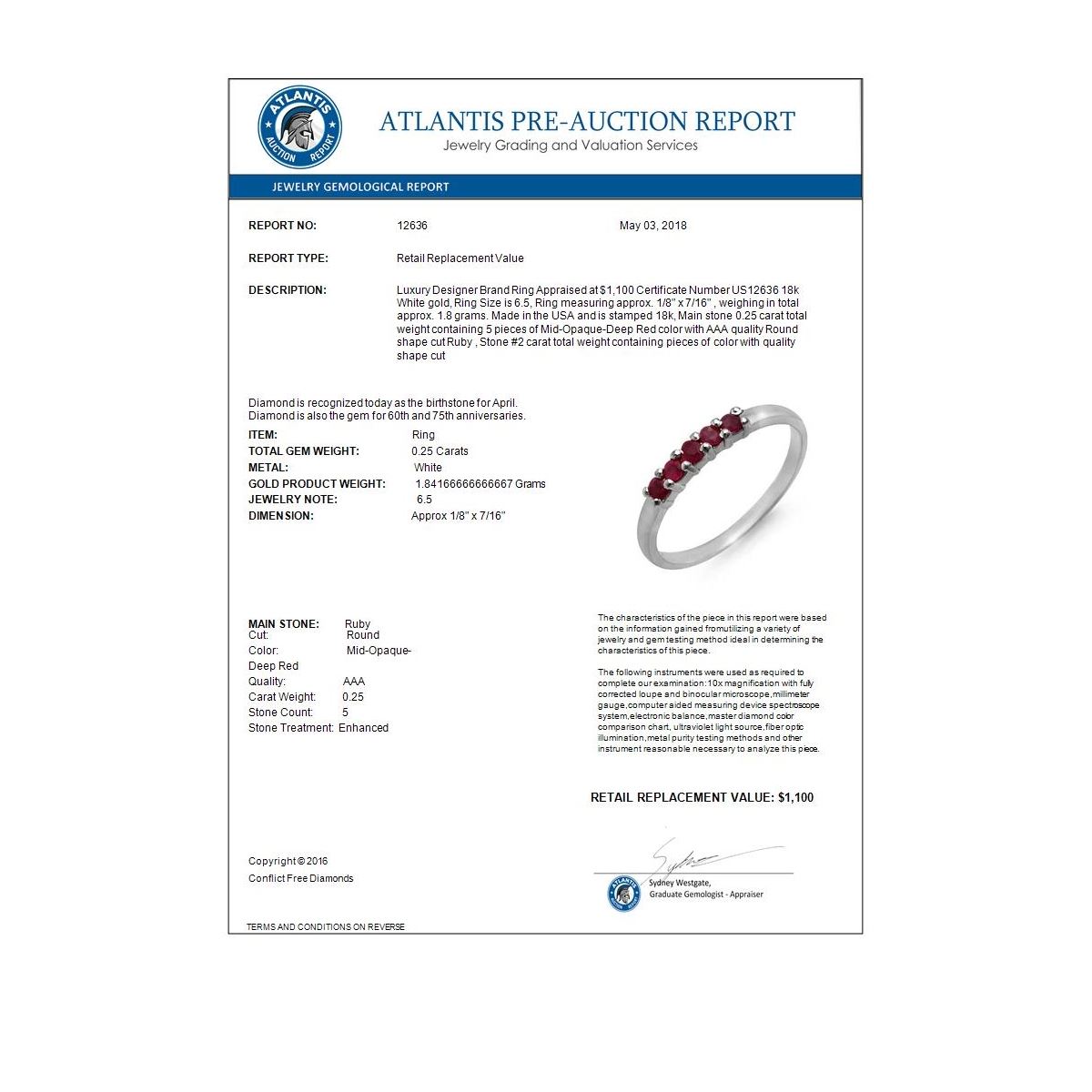 REF-16N8Y -12636 ---- 0.25 CTW Ruby Ring 18K White Gold ---- Luxury Designer Brand Ring Appraised at $1,100 Certificate Number US12636 18k White gold, Ring Size is 6.5, Ring measuring approx. 1/8" x 7/16" , weighing in total approx. 1.8 grams. Made in the USA and is stamped 18k, Main stone 0.25 carat total weight containing 5 pieces of Mid-Opaque-Deep Red color with AAA quality Round shape cut Ruby , Stone #2 carat total weight containing pieces of color with quality shape cut