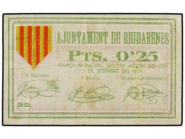 0,25 Pessetes. 5 Setembre 1937. Aj. de RIUDARENES. (Algo sucio). ESCASO. AT-2147; T-2484. MBC+.