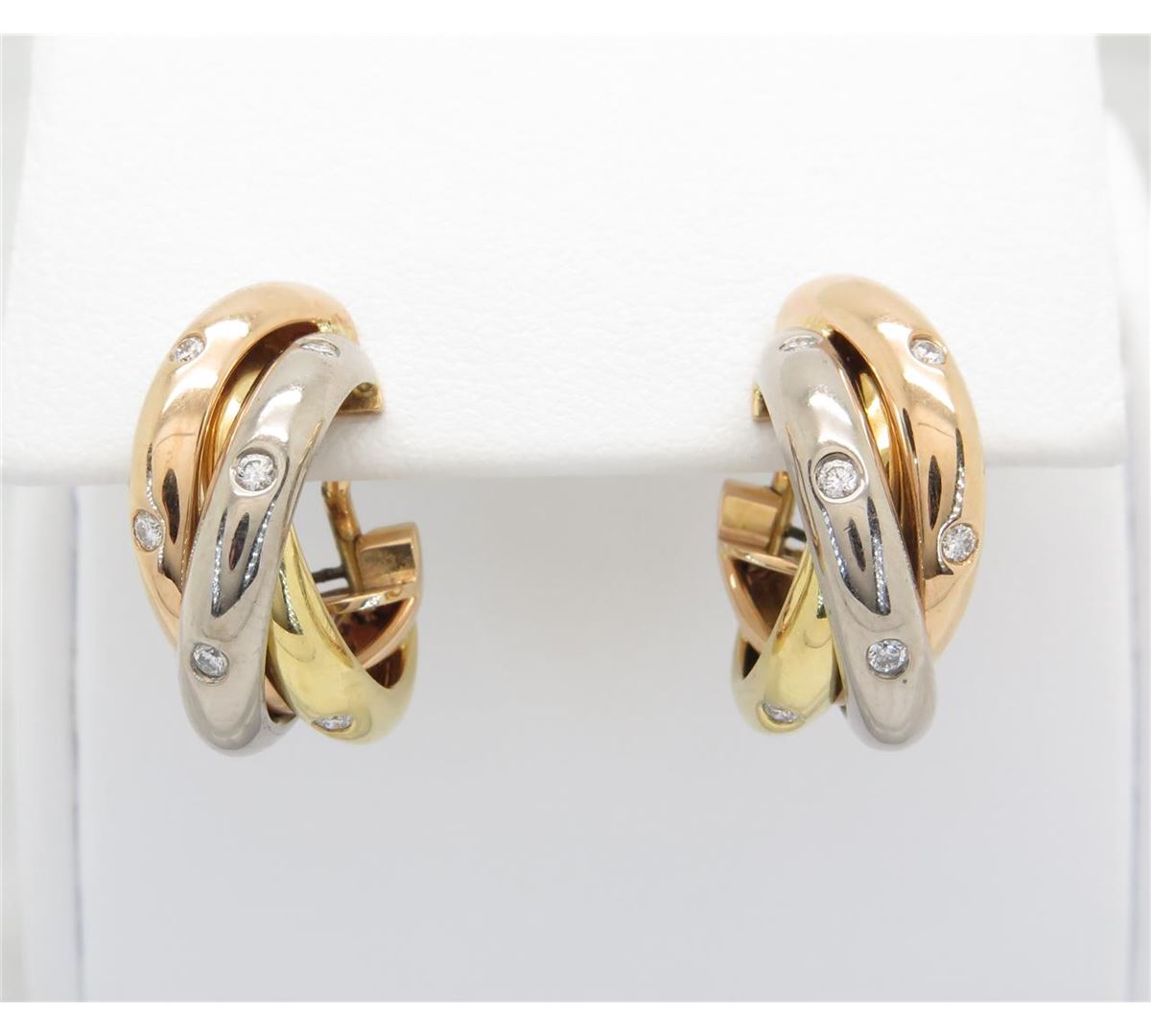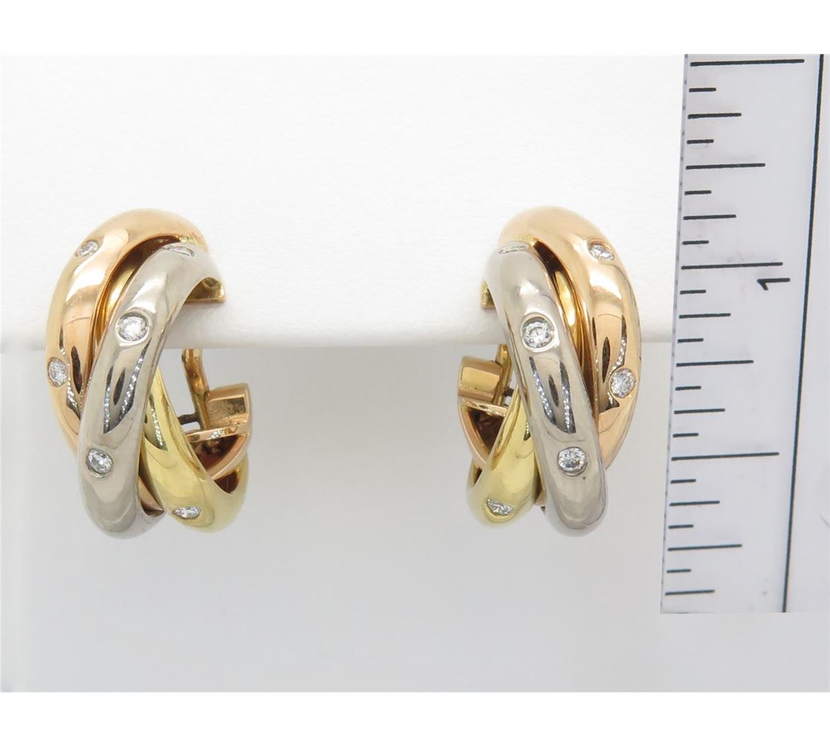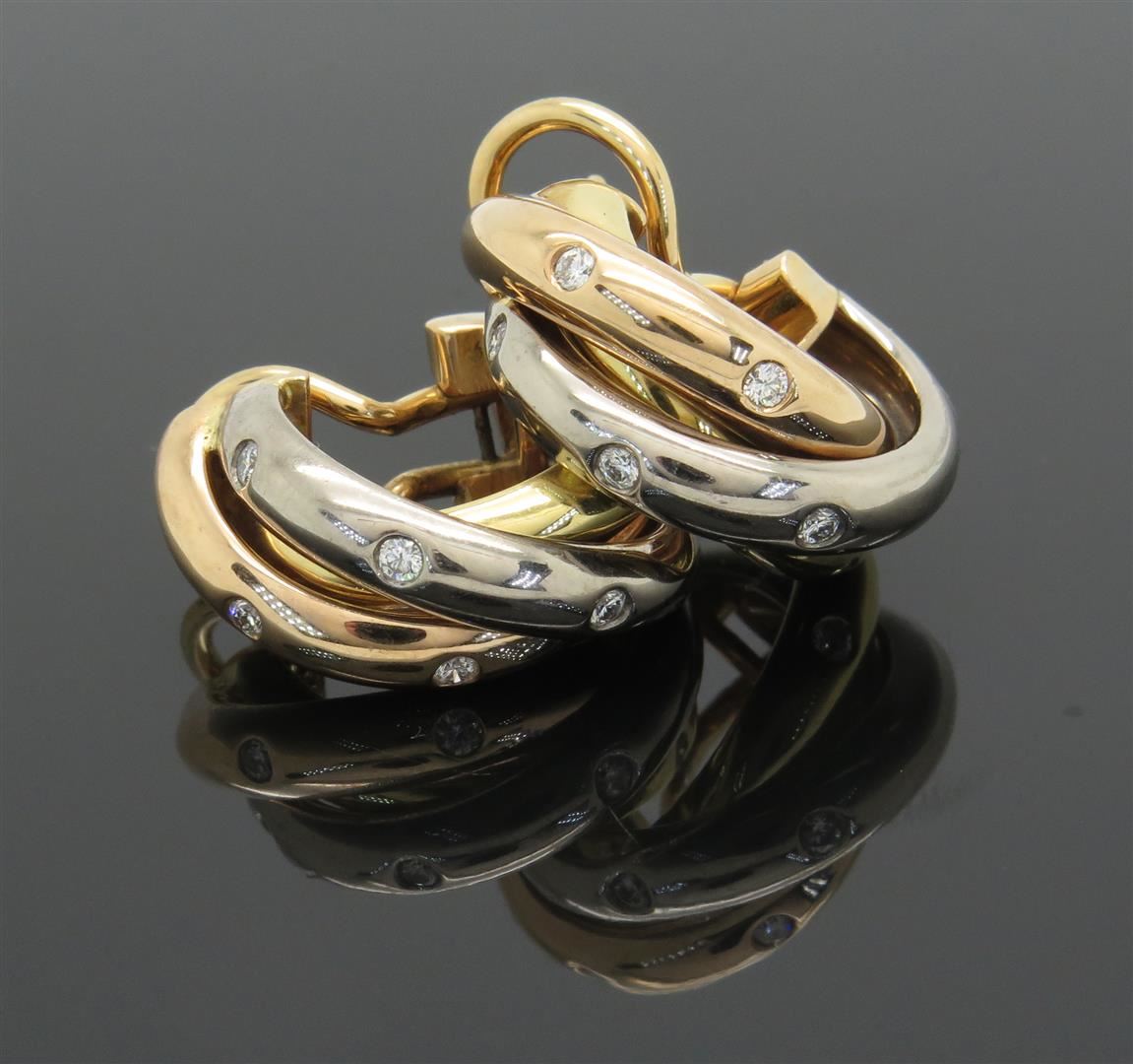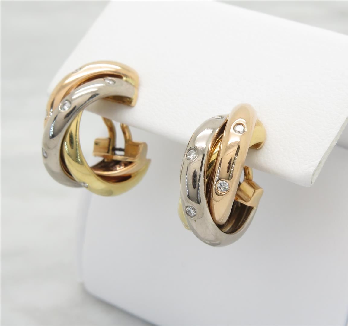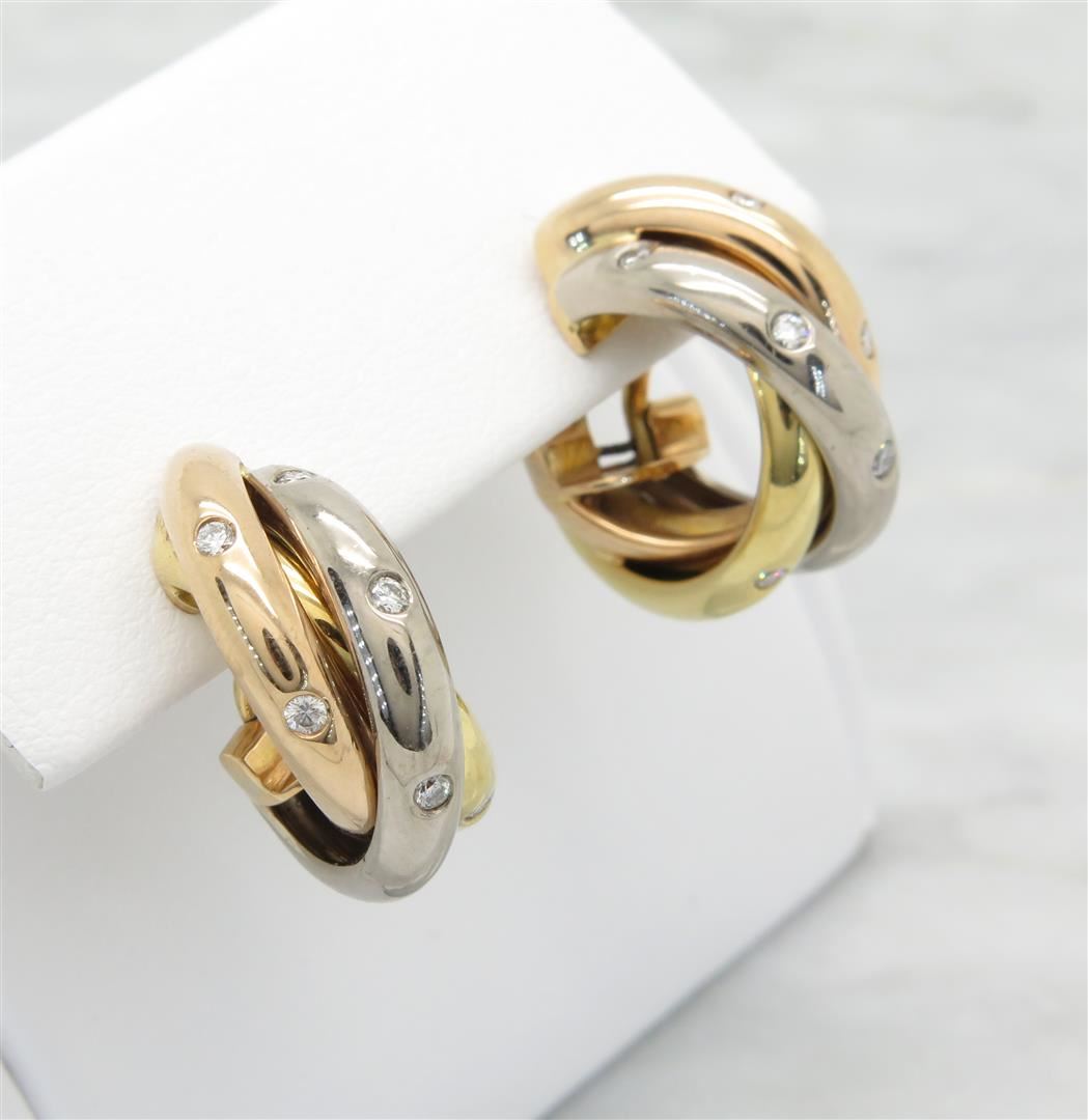 One tested pair of 18K white, yellow and rose gold designer Cartier Trinity diamond earrings. Containing: 12 Round Brilliant Cut Diamonds. Clarity: VS, Color: F-G. Approximate total diamond weight: .25CTW. All diamonds are graded in the mounting unless otherwise stated. Weight of earrings: 15.0 grams.