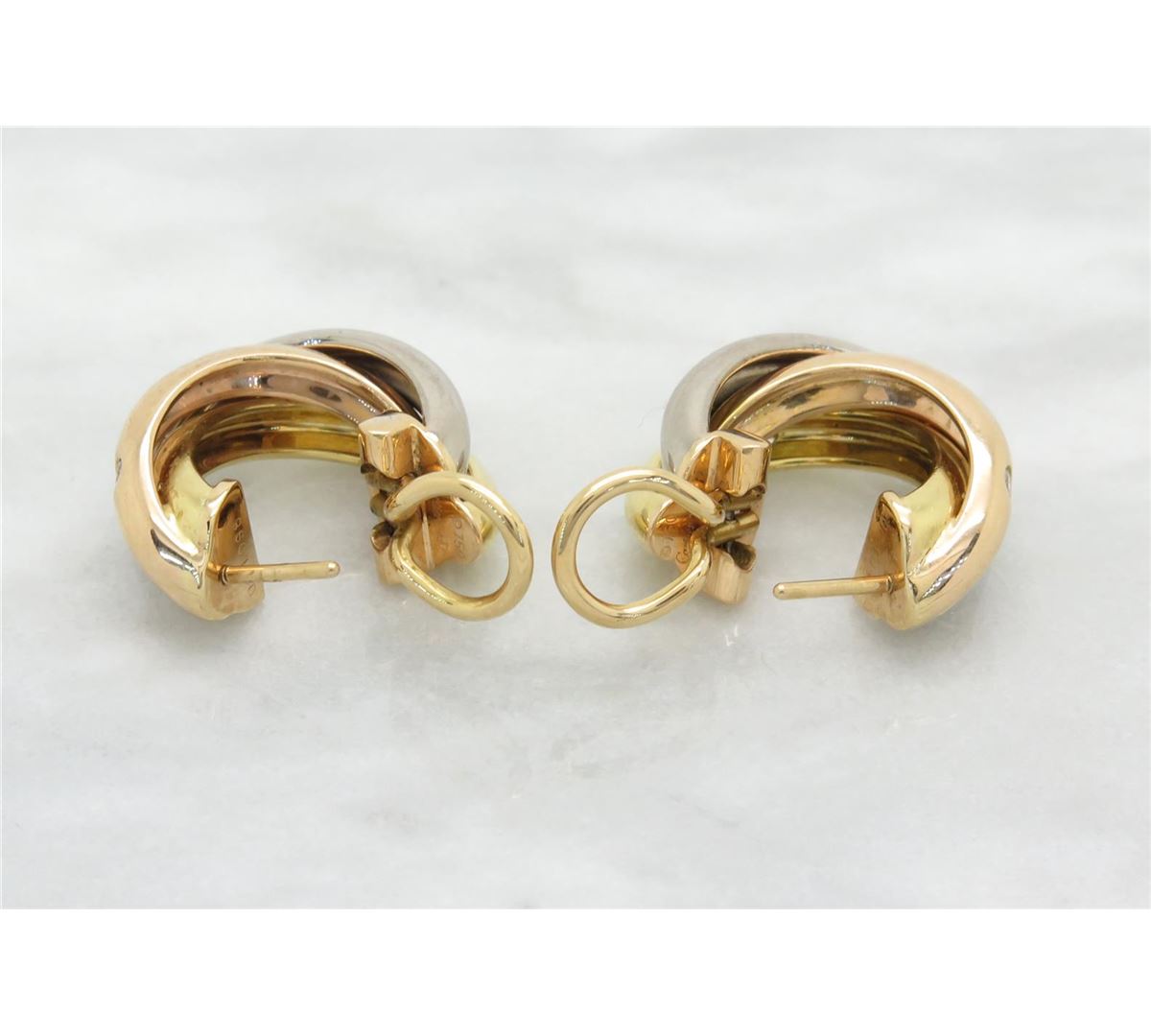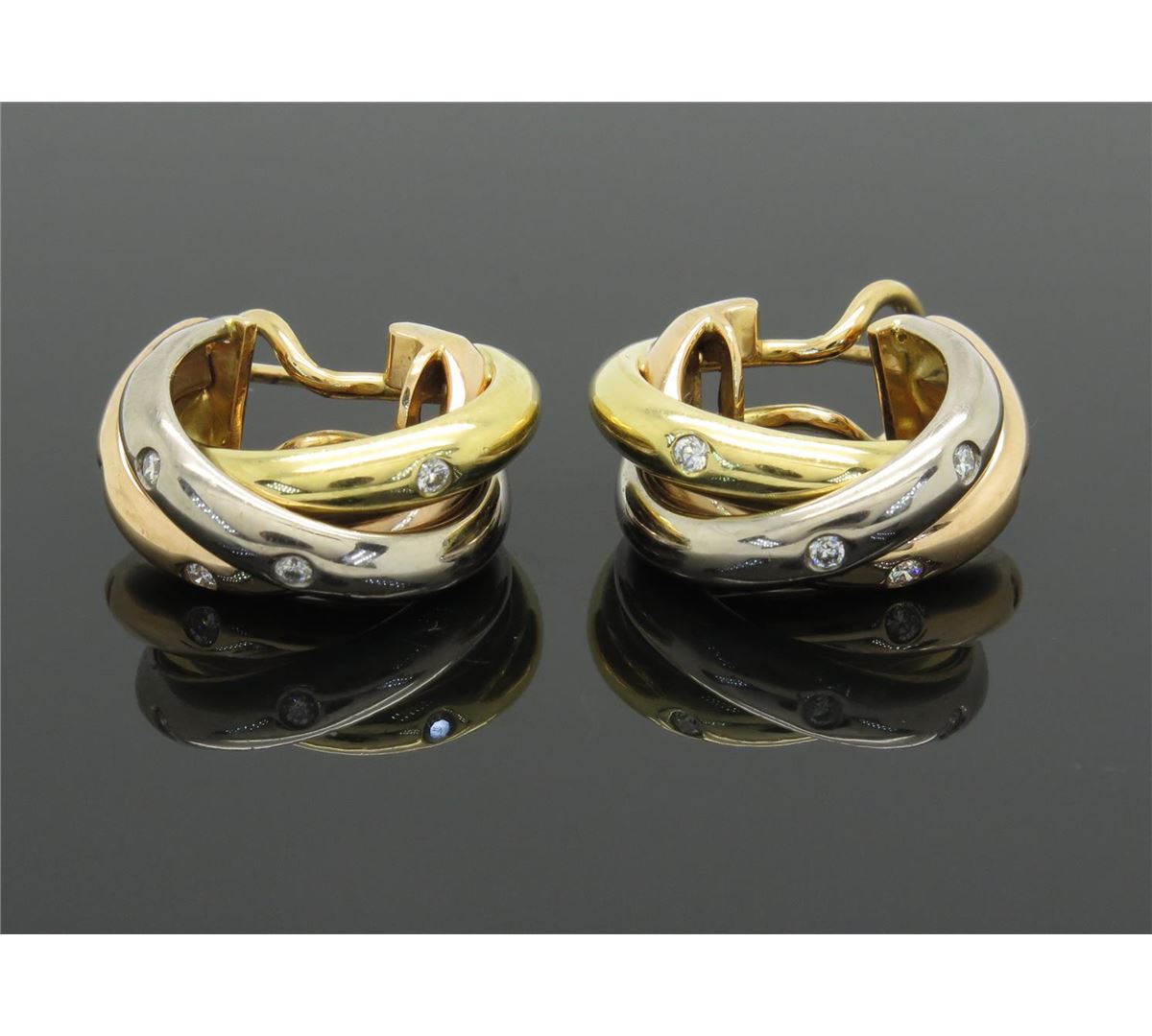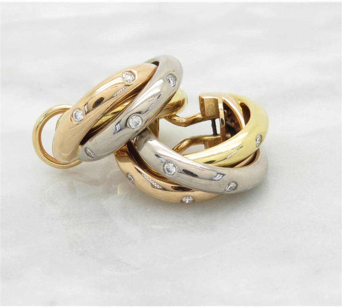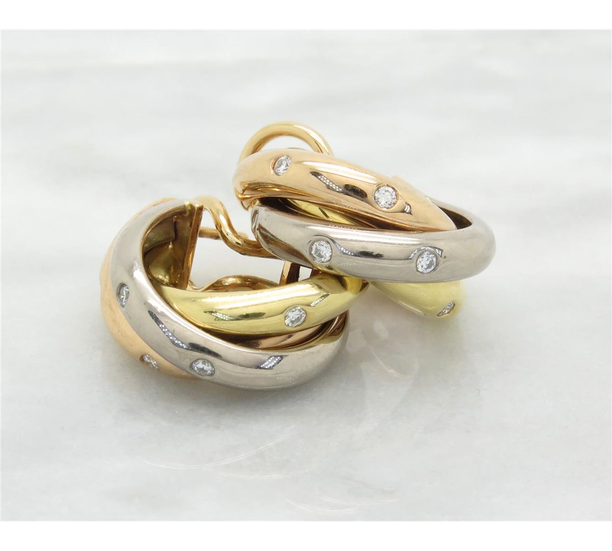 One tested pair of 18K white, yellow and rose gold designer Cartier Trinity diamond earrings. Containing: 12 Round Brilliant Cut Diamonds. Clarity: VS, Color: F-G. Approximate total diamond weight: .25CTW. All diamonds are graded in the mounting unless otherwise stated. Weight of earrings: 15.0 grams.