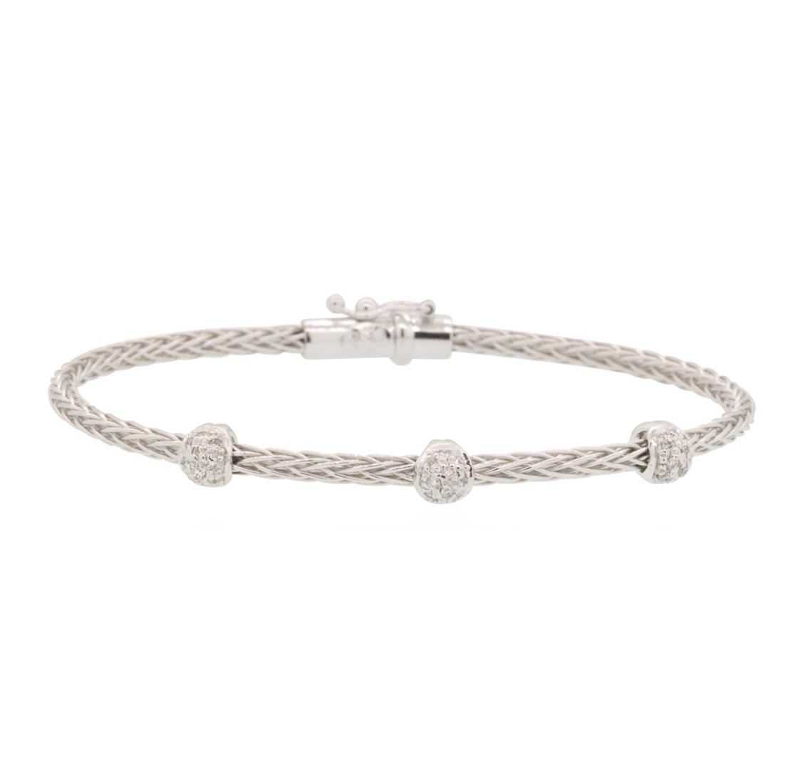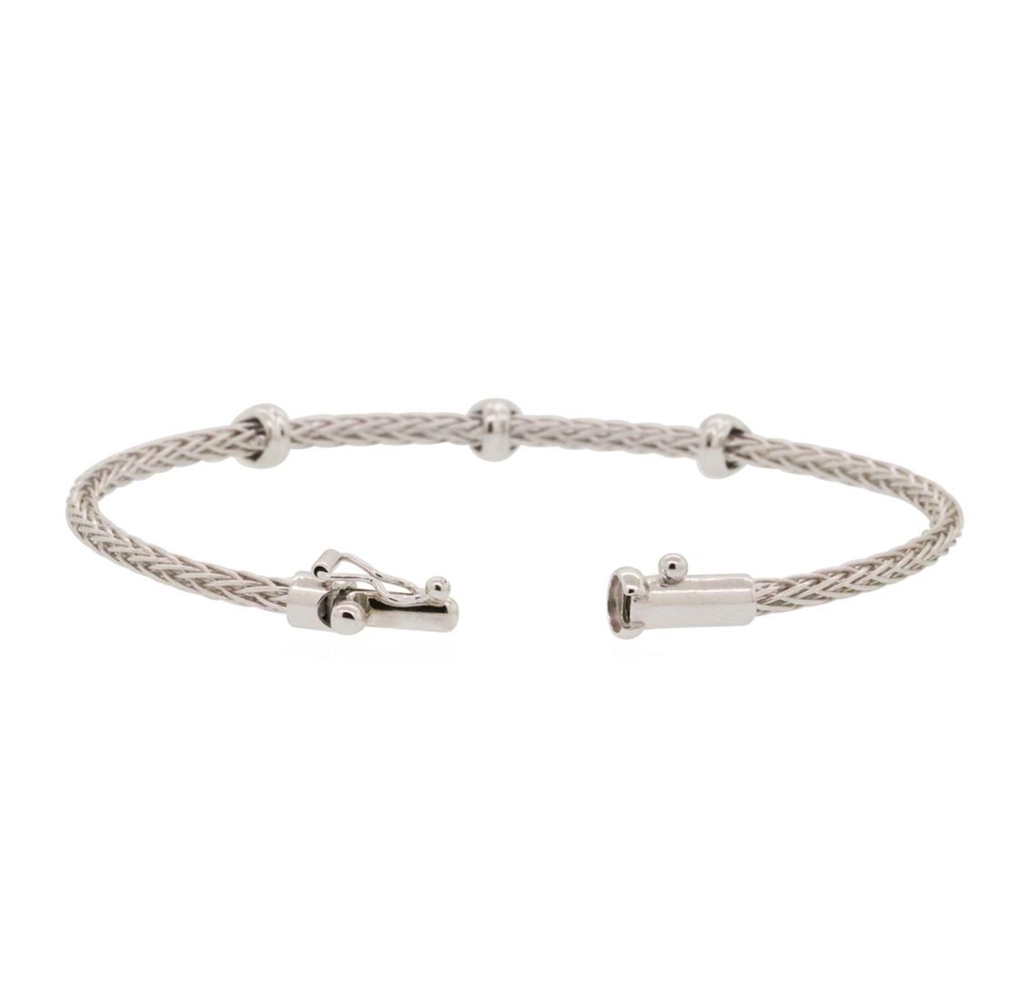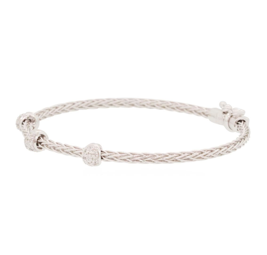 One lady's fox-tail bangle bracelet with a tongue clasp with foldover safety featuring: 18KT white gold weighing 10.40 grams containing diamonds weighing 0.25ctw. The bracelet measures seven inches in length.