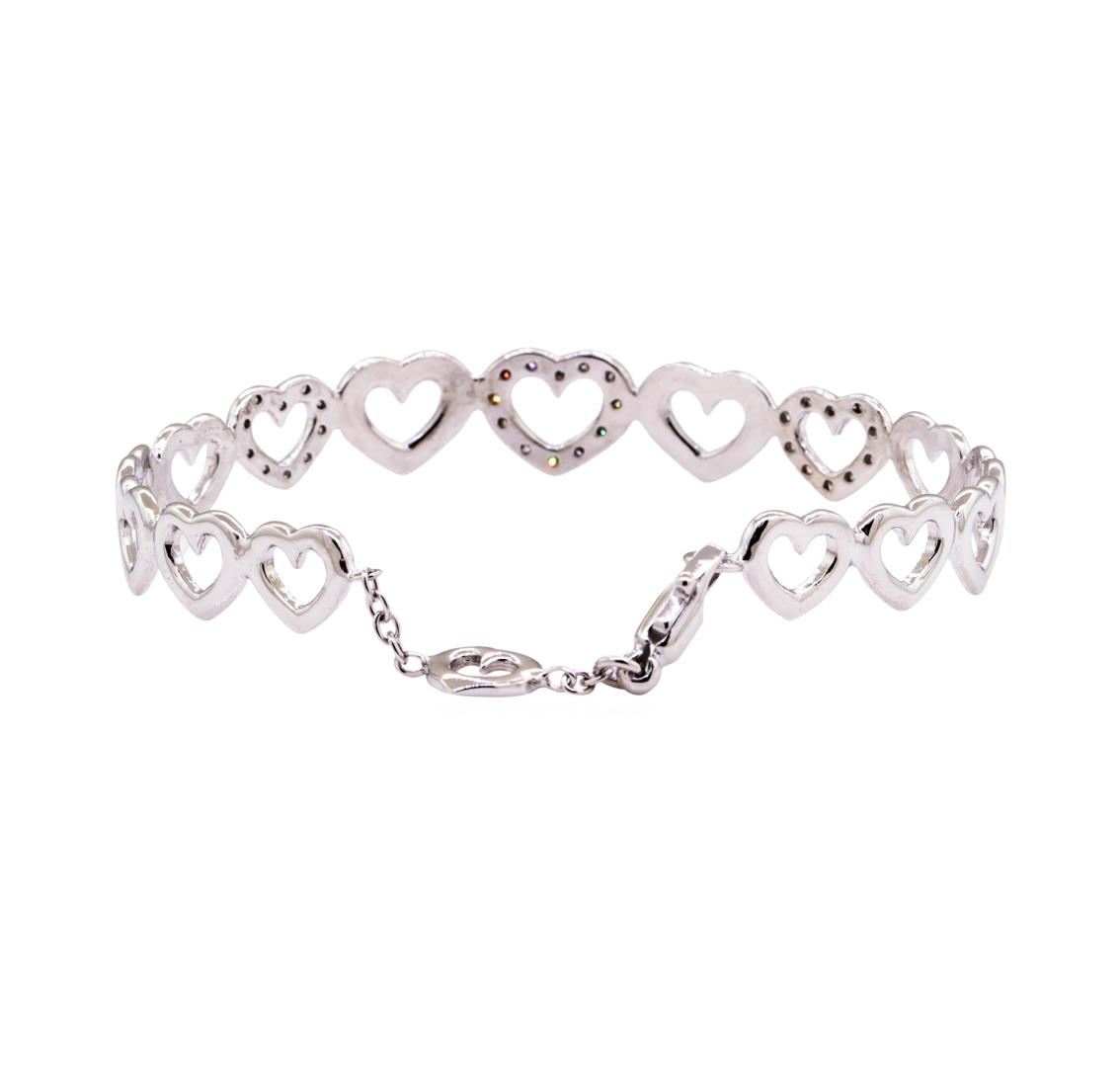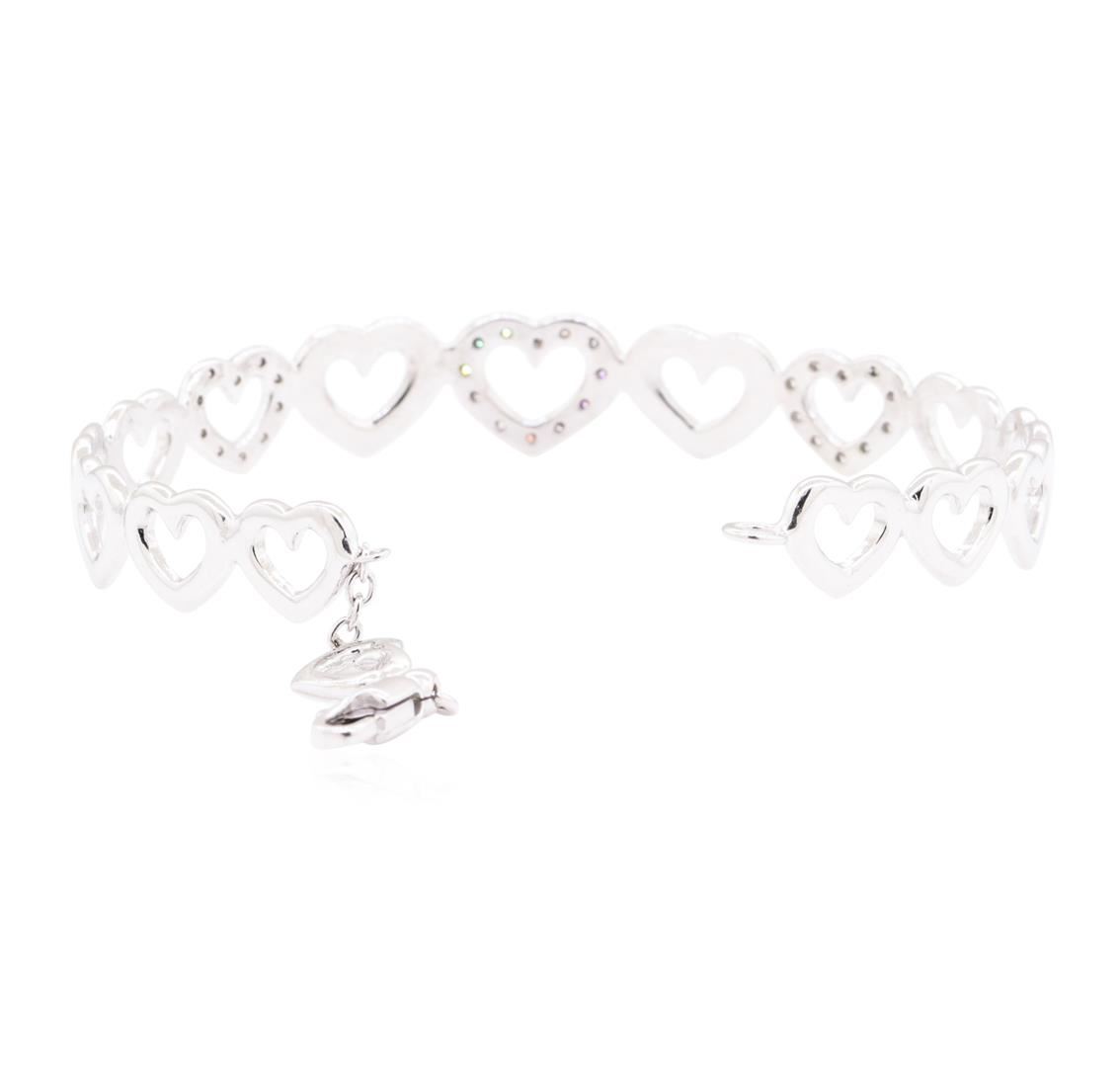 One heart motif bangle bracelet featuring: 14KT white gold weighing 11.7 grams containing diamonds weighing 0.25ctw. The bangle measures approximately six inches in length.