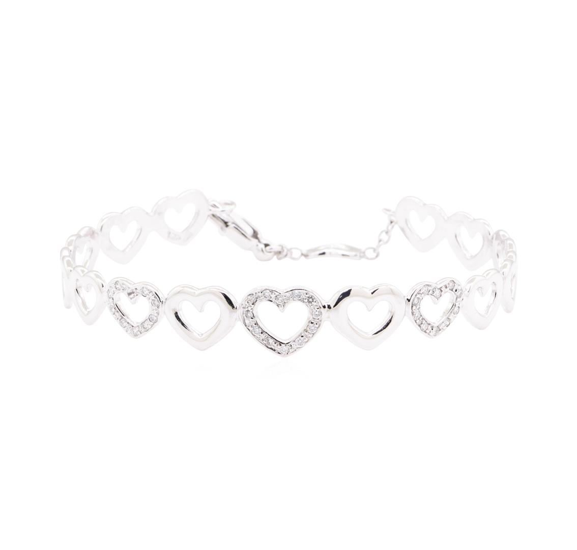 One heart motif bangle bracelet featuring: 14KT white gold weighing 11.7 grams containing diamonds weighing 0.25ctw. The bangle measures approximately six inches in length.