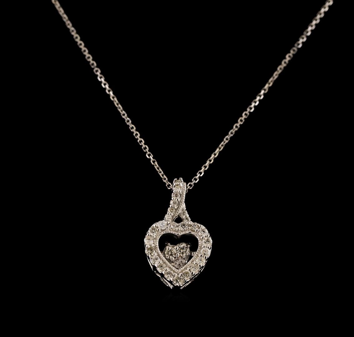 One electronically tested 14KT white gold lady's combination cast & assembled heart shape pendant & chain 18.0' long, 1mm diamond cut oval cable link with a spring ring clasp with a bright polish with milgrain detailing finish. The featured lady's heart shaped pendant has a heart shaped dancing diamond motif. Identified with markings of '14K'. Condition is new, good workmanship. Containing: Three prong set round brilliant cut diamonds, measuring 1.60 - 1.50 x 0.96mm (depth est.) approximate total weight of 3 Stones = 0.04ct. Graded in the setting. Clarity SI-1 to SI-2. Color: H - I Cut Good Seventeen prong set round brilliant cut diamonds, measuring 1.40 - 1.35 x 0.86mm (depth est.) approximate total weight of 17 Stones = 0.17ct. Graded in the setting. Clarity SI-1 to I-1. Color: H - I Cut Good Eight prong set round brilliant cut diamonds, measuring 1.15 - 1.05 x 0.68mm (depth est.) approximate total weight of 8 Stones = 0.04ct. Graded in the setting. Clarity SI-1 to SI-2. Color: H - I Cut Good. Total Weight of Diamonds 0.25ct.. Total Weight of Pendant & Chain 2.90gm. GAS Appraised at $1,290.00.
