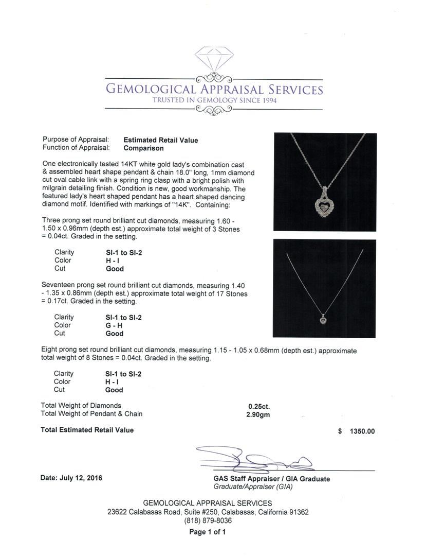 One electronically tested 14KT white gold lady's combination cast & assembled heart shape pendant & chain 18.0' long, 1mm diamond cut oval cable link with a spring ring clasp with a bright polish with milgrain detailing finish. The featured lady's heart shaped pendant has a heart shaped dancing diamond motif. Identified with markings of '14K'. Condition is new, good workmanship. Containing: Three prong set round brilliant cut diamonds, measuring 1.60 - 1.50 x 0.96mm (depth est.) approximate total weight of 3 Stones = 0.04ct. Graded in the setting. Clarity SI-1 to SI-2. Color: H - I Cut Good Seventeen prong set round brilliant cut diamonds, measuring 1.40 - 1.35 x 0.86mm (depth est.) approximate total weight of 17 Stones = 0.17ct. Graded in the setting. Clarity SI-1 to SI-2. Color: G - H Cut Good Eight prong set round brilliant cut diamonds, measuring 1.15 - 1.05 x 0.68mm (depth est.) approximate total weight of 8 Stones = 0.04ct. Graded in the setting. Clarity SI-1 to SI-2. Color: H - I Cut Good. Total Weight of Diamonds 0.25ct.. Total Weight of Pendant & Chain 2.90gm. GAS Appraised at $1,350.00.