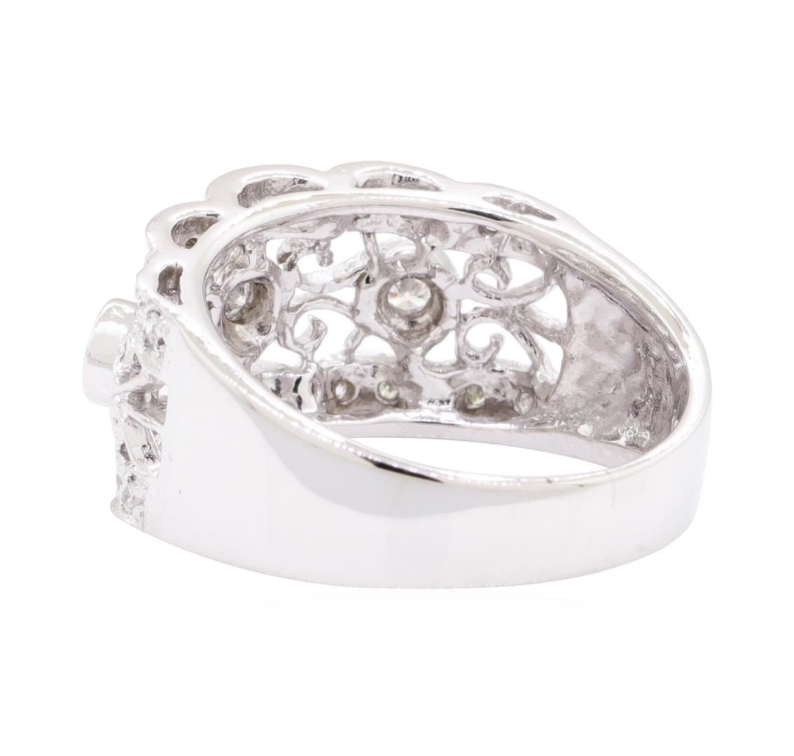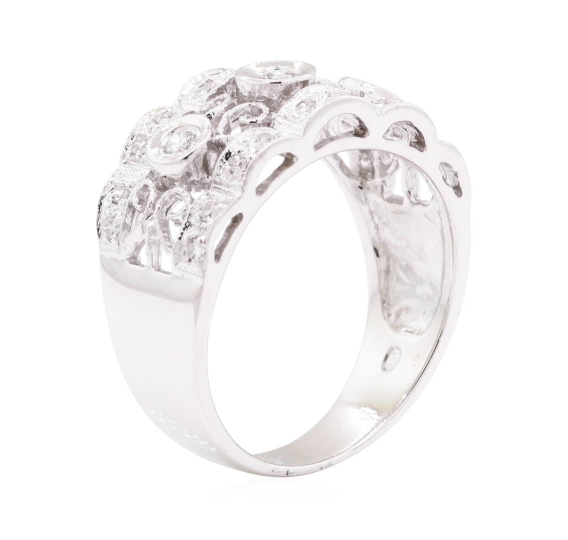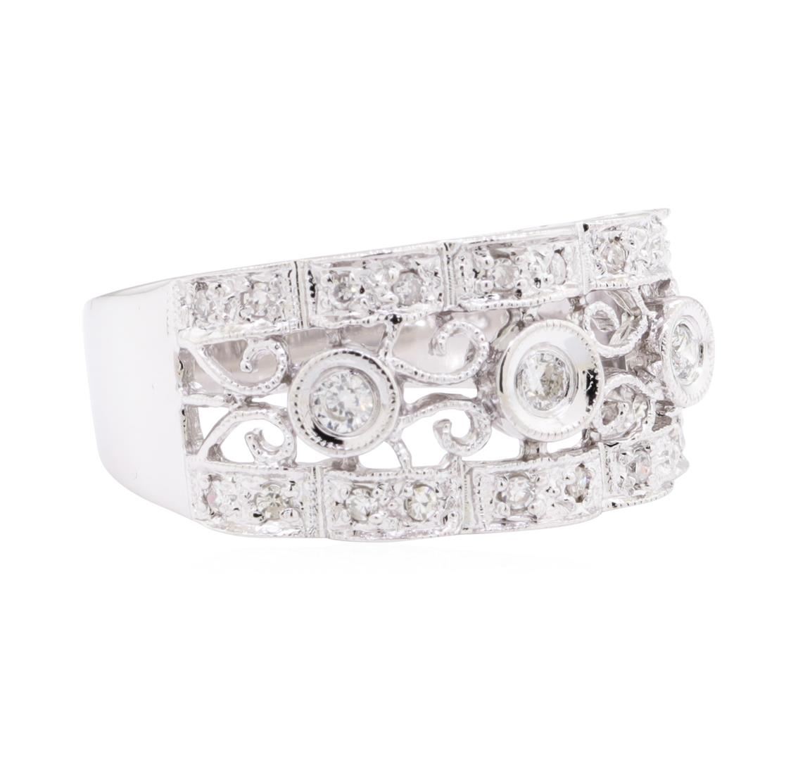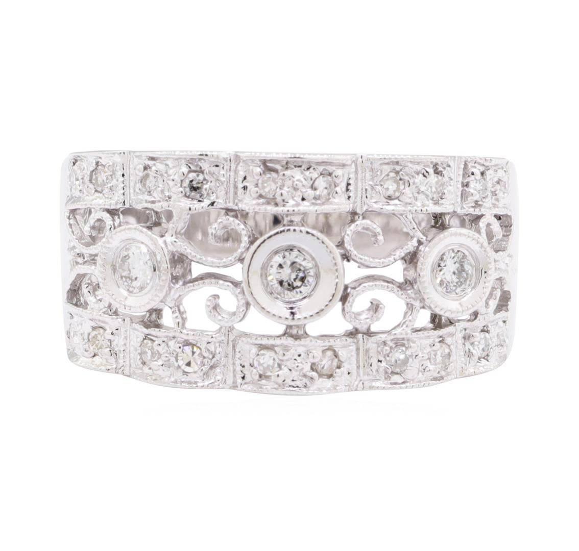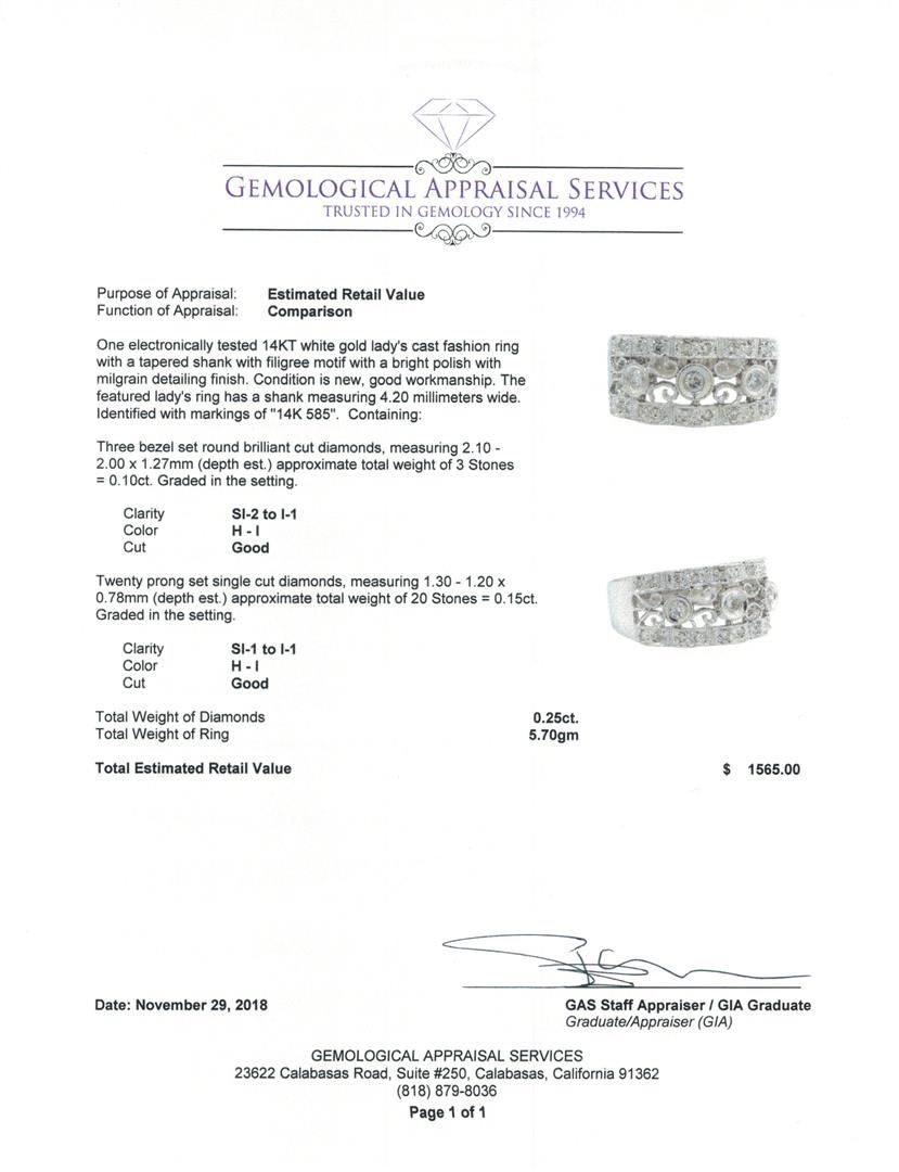 One electronically tested 14KT white gold lady's cast fashion ring with a tapered shank with filigree motif with a bright polish with milgrain detailing finish. The featured lady's ring has a shank measuring 4.20 millimeters wide. Identified with markings of '14K 585'. Condition is new, good workmanship. Containing: Three bezel set round brilliant cut diamonds, measuring 2.10 - 2.00 x 1.27mm (depth est.) approximate total weight of 3 Stones = 0.10ct. Graded in the setting. Color H - I Clarity SI-2 to I-1 Cut Good Twenty prong set single cut diamonds, measuring 1.30 - 1.20 x 0.78mm (depth est.) approximate total weight of 20 Stones = 0.15ct. Graded in the setting. Color H - I Clarity SI-1 to I-1 Cut Good. Total Weight of Diamonds 0.25ct.. Total Weight of Ring 5.70gm GAS Appraised at $1565.00. GAS Appraised at $1,565.00.