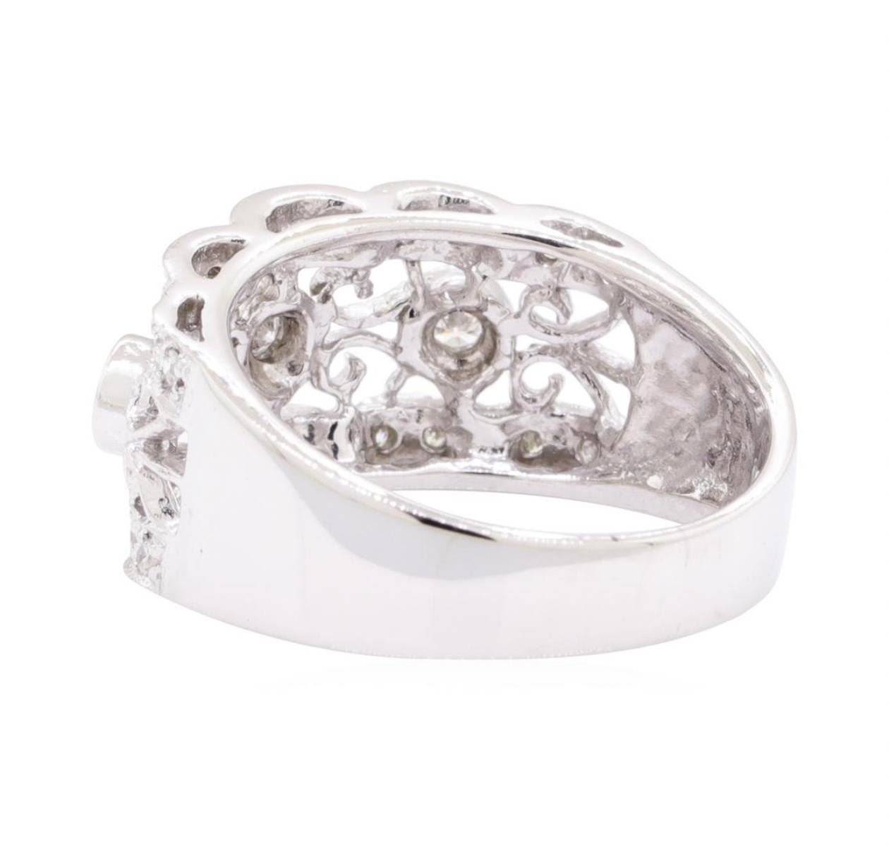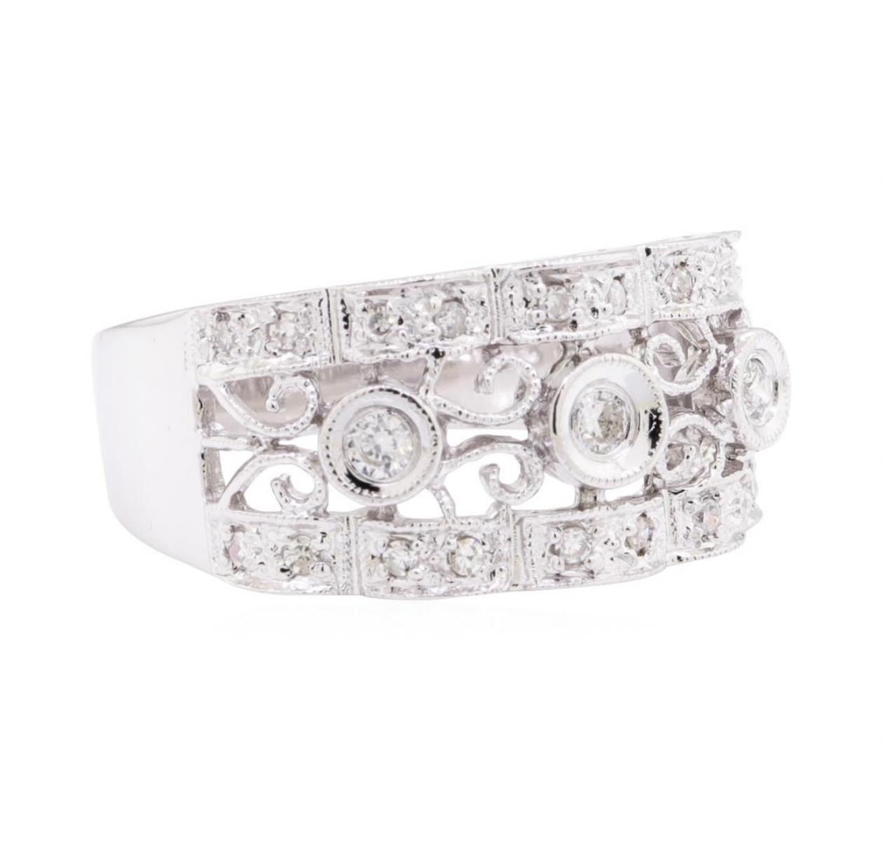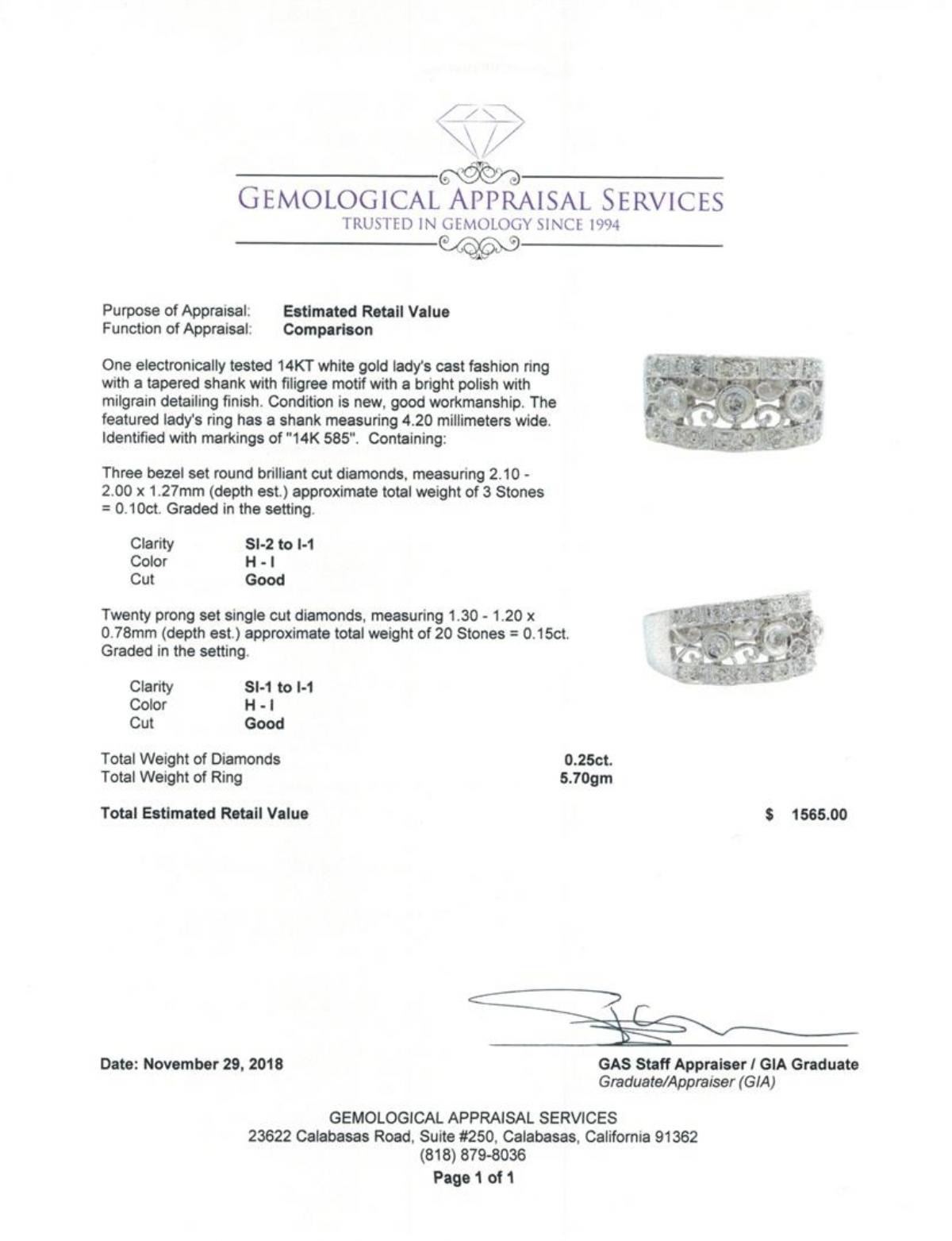 One electronically tested 14KT white gold lady's cast fashion ring with a tapered shank with filigree motif with a bright polish with milgrain detailing finish. The featured lady's ring has a shank measuring 4.20 millimeters wide. Identified with markings of '14K 585'. Condition is new, good workmanship. Containing: Three bezel set round brilliant cut diamonds, measuring 2.10 - 2.00 x 1.27mm (depth est.) approximate total weight of 3 Stones = 0.10ct. Graded in the setting. Color H - I Clarity SI-2 to I-1 Cut Good Twenty prong set single cut diamonds, measuring 1.30 - 1.20 x 0.78mm (depth est.) approximate total weight of 20 Stones = 0.15ct. Graded in the setting. Color H - I Clarity SI-1 to I-1 Cut Good. Total Weight of Diamonds 0.25ct.. Total Weight of Ring 5.70gm GAS Appraised at $1565.00. GAS Appraised.