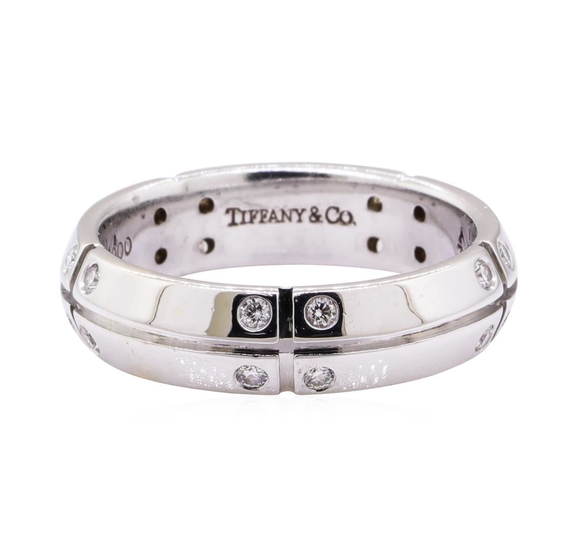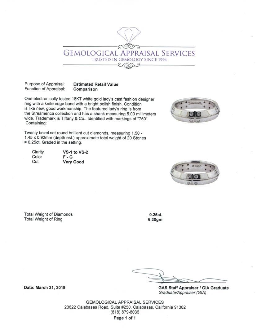One electronically tested 18KT white gold lady's cast fashion designer ring with a knife edge band with a bright polish finish. The featured lady's ring is from the Streamerica collection and has a shank measuring 5.00 millimeters wide. Trademark is Tiffany & Co. Identified with markings of '750'. Condition is like new, good workmanship. Containing: Twenty bezel set round brilliant cut diamonds, measuring 1.50 - 1.45 x 0.92mm (depth est.) approximate total weight of 20 Stones = 0.25ct. Graded in the setting. Color F - G Clarity VS-1 to VS-2 Cut Very Good. Total Weight of Diamonds 0.25ct.. Total Weight of Ring 6.30gm GAS Appraised at $1950.00. GAS Appraised at $1,950.00.