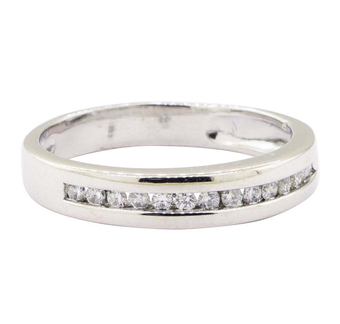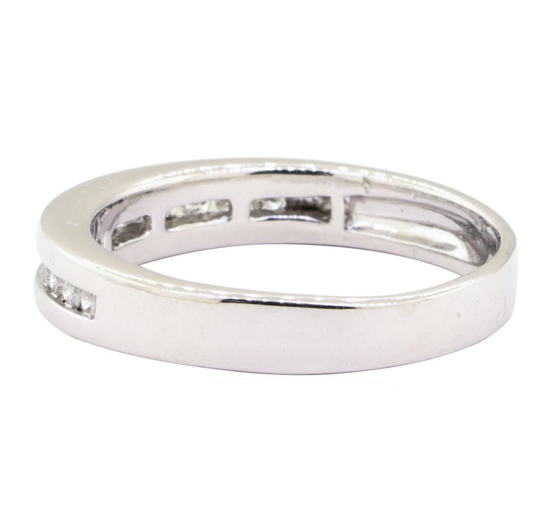 One straight line channel band featuring: 14KT white gold weighing 3.6 grams containing diamonds weighing 0.25ctw.