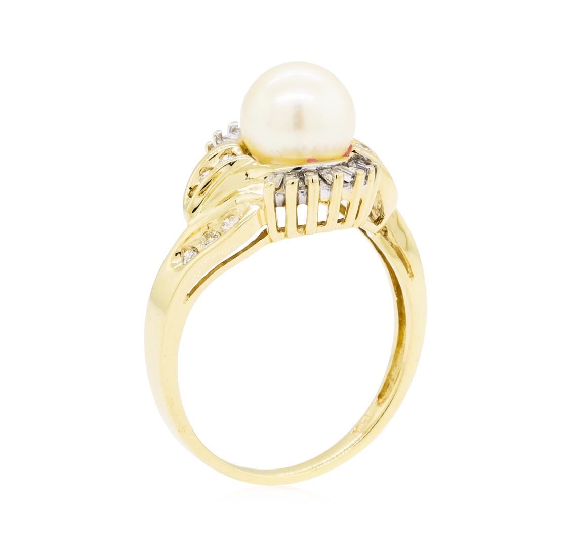 One lady's ring featuring: 14KT yellow gold weighing 3.7 grams containing one 6.5mm pearl and diamonds weighing 0.25ctw.