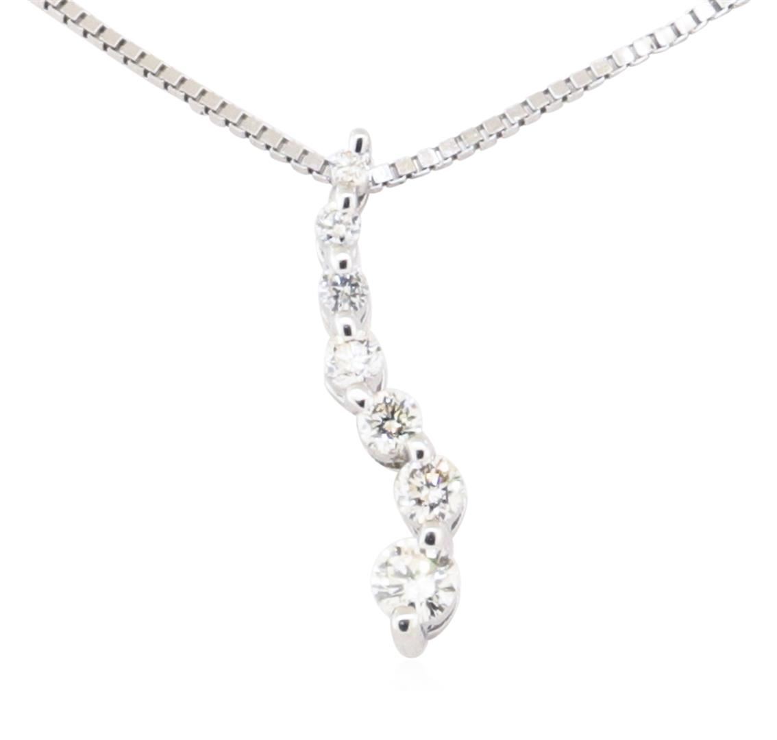 One Journey of Life pendant with an attached 0.7mm box chain measuring sixteen inches in length featuring: 14KT white gold weighing 2.4 grams containing diamonds weighing 0.25ctw.