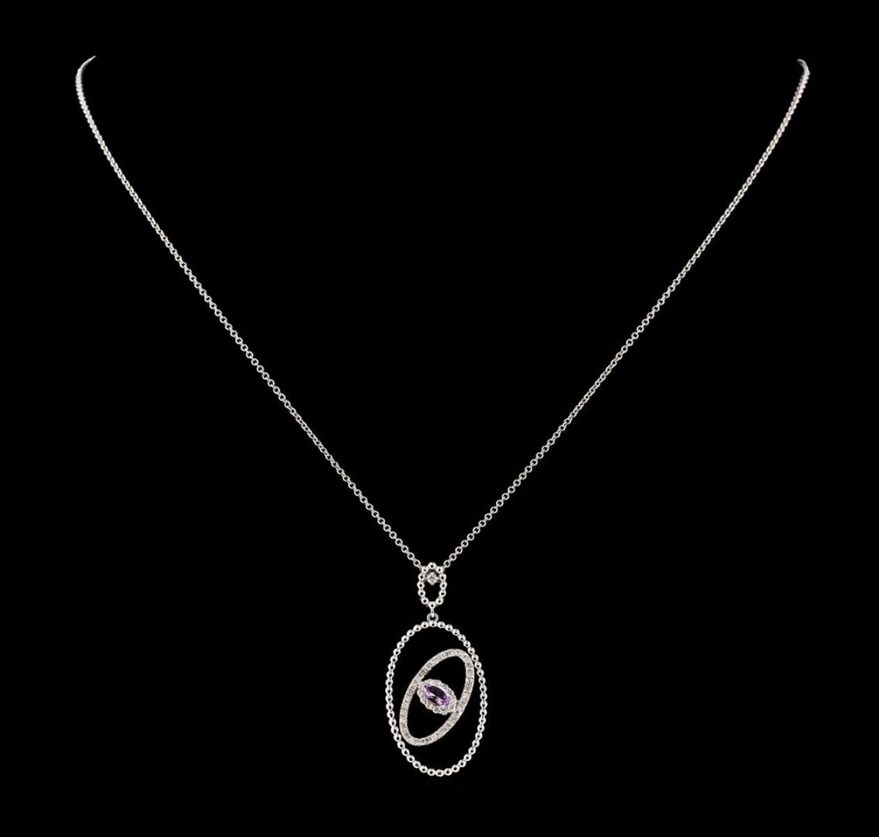 One Morganite and Diamond Pendant With Chain featuring: 14KT White Gold with a total weight of 2.95 grams, morganite with a total weight of 0.25ct, and 45 Diamonds with a total weight of 0.30ctw.