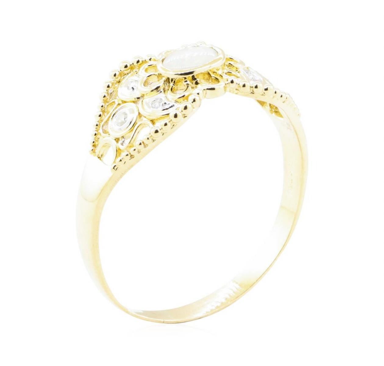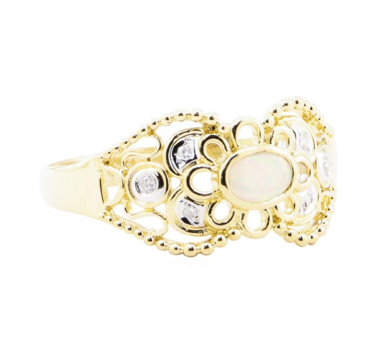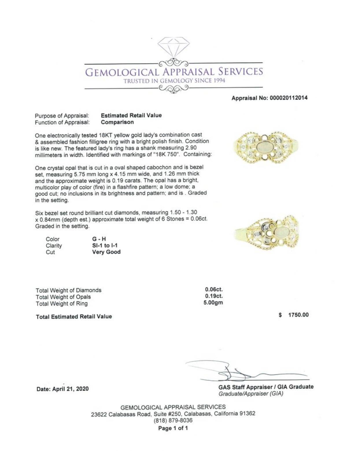 One electronically tested 18KT yellow gold lady's combination cast & assembled fashion filligree ring with a bright polish finish. The featured lady's ring has a shank measuring 2.90 millimeters in width. Identified with markings of '18K 750'. Condition is like new. Containing: One crystal opal that is cut in a oval shaped cabochon and is bezel set, measuring 5.75 mm long x 4.15 mm wide, and 1.26 mm thick and the approximate weight is 0.19 carats. The opal has a bright, multicolor play of color (fire) in a flashfire pattern; a low dome; a good cut; no inclusions in its brightness and pattern; and is. Graded in the setting. Six bezel set round brilliant cut diamonds, measuring 1.50 - 1.30 x 0.84mm (depth est.) approximate total weight of 6 Stones = 0.06ct. Graded in the setting. Color G - H Clarity SI-1 to I-1 Cut Very Good. Total Weight of Diamonds 0.06ct.. Total Weight of Opals 0.19ct.. Total Weight of Ring 5.00gm GAS Appraised at $1750.00. GAS Appraised.